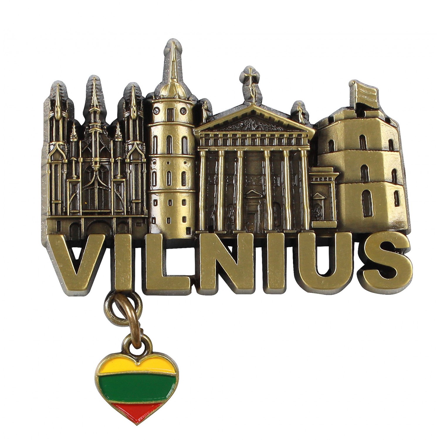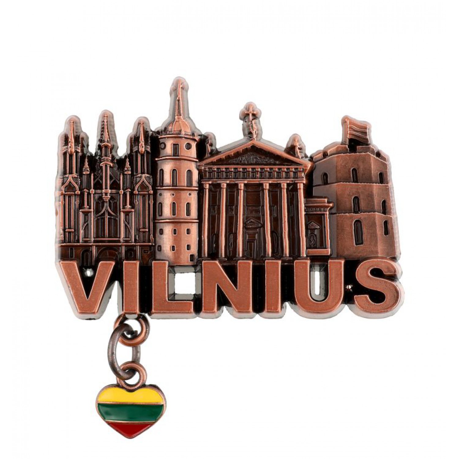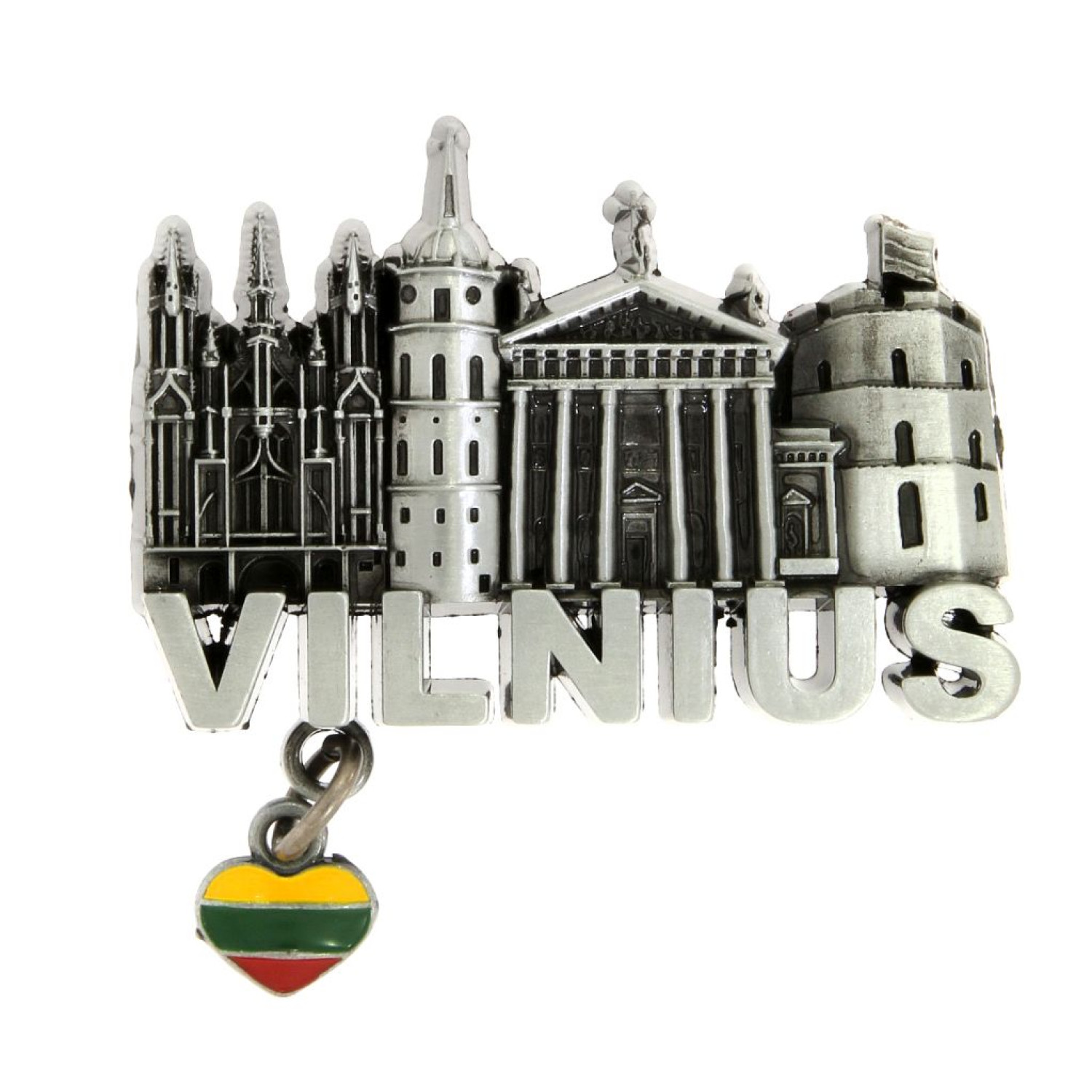 Išskirtinio dizaino metalinis magnetas su žymiausiais Vilniaus objektais ir užrašu Vilnius. Papuoštas lietuviškos trispalvės širdute, šis magnetas yra stilingas ir patvarus suvenyras. Puikiai tinka turistams, miesto svečiams ar lietuviškos atributikos mėgėjams. Magnetas lengvai pritvirtinamas prie šaldytuvo ar kitų metalinių paviršių. Galima rinktis iš trijų spalvų – sidabro, vario arba bronzos.
