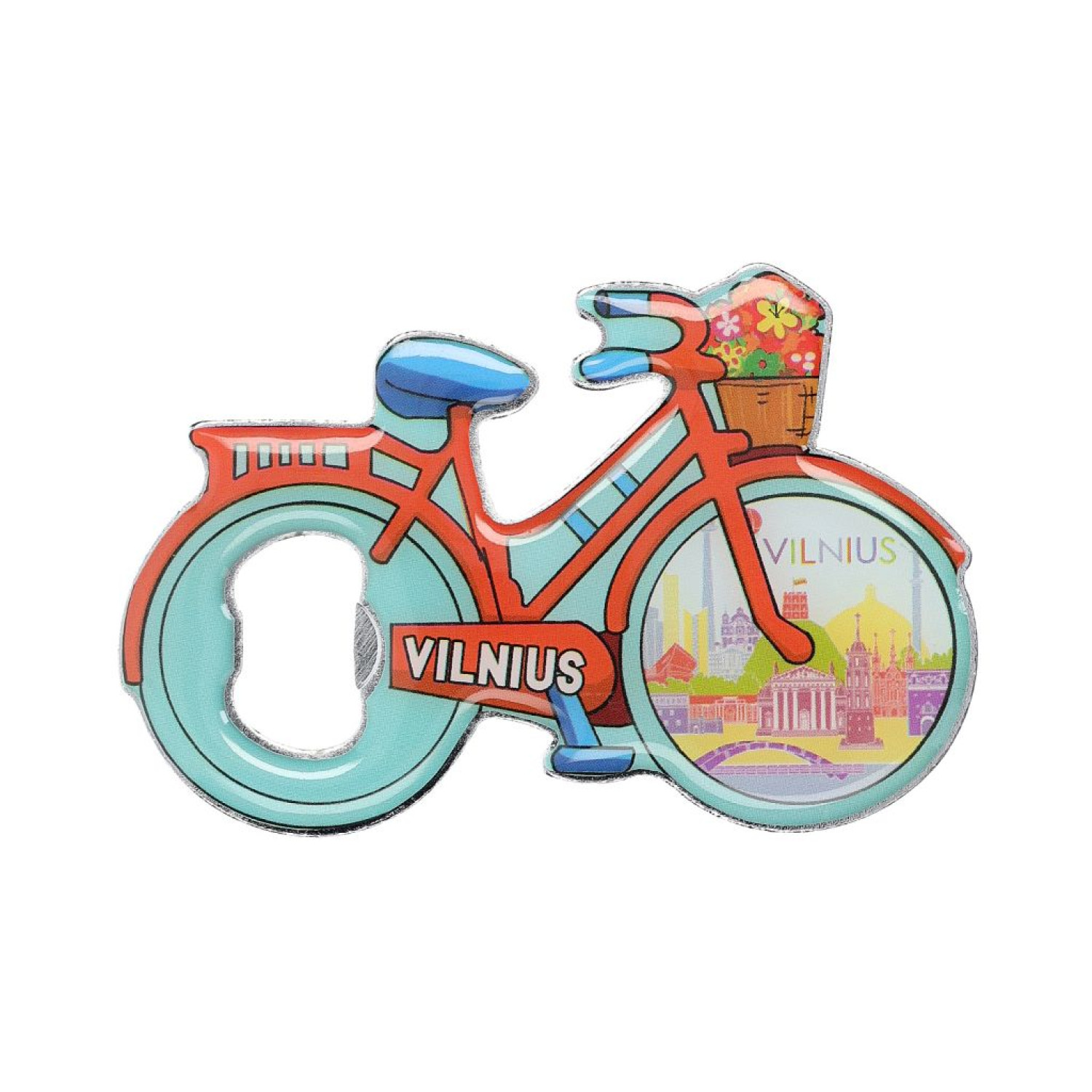 Oranžinis dviračio formos magnetas atidarytuvas su Vilniaus vaizdu