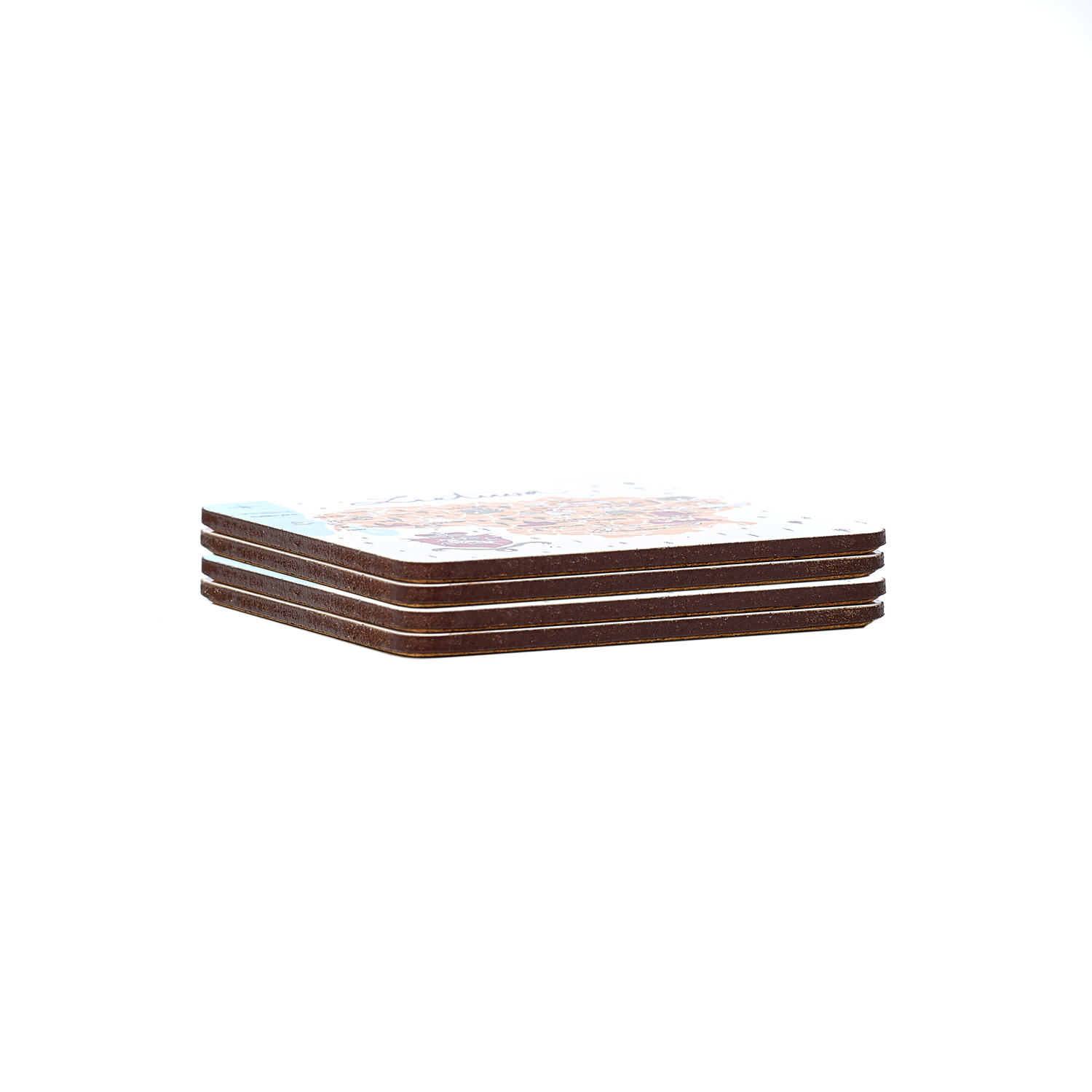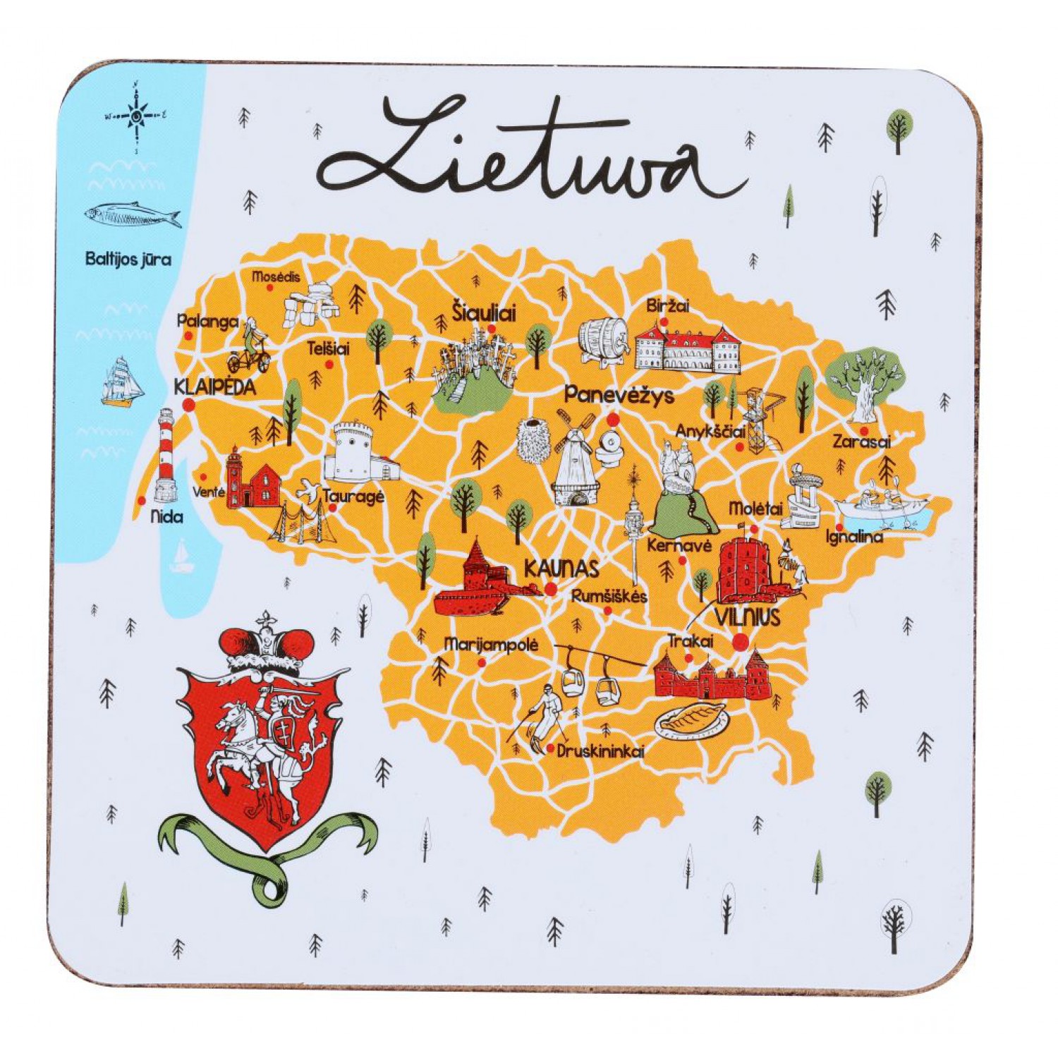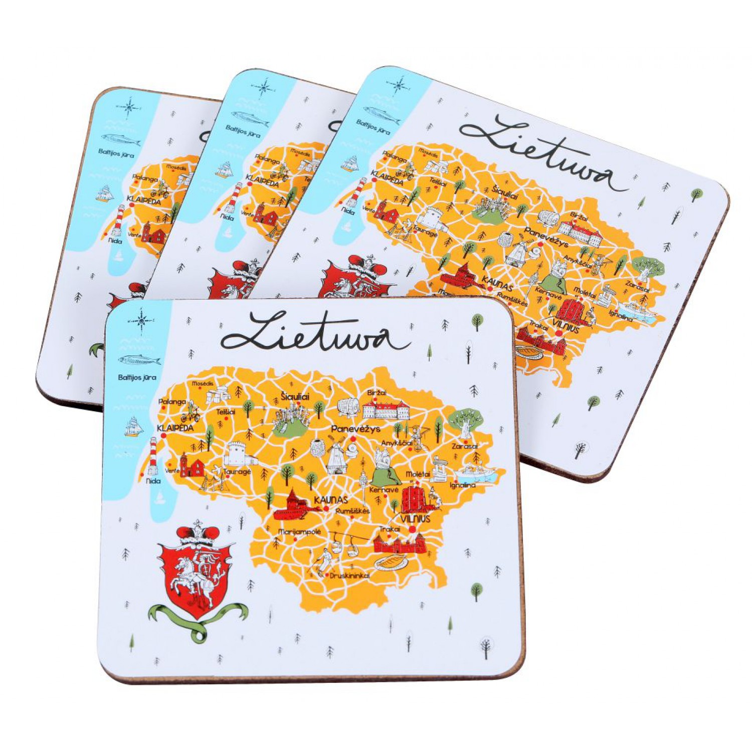 Kamštiniai padėkliukai puodeliams, dekoruoti spalvingu Lietuvos žemėlapiu. Kiekvienas padėkliukas vaizduoja žymiausius miestus ir gamtos objektus. Pagaminti iš natūralaus kamščio – lengvi, praktiški, saugantys paviršius nuo karščio ir drėgmės. Komplekte 4 vienetai.