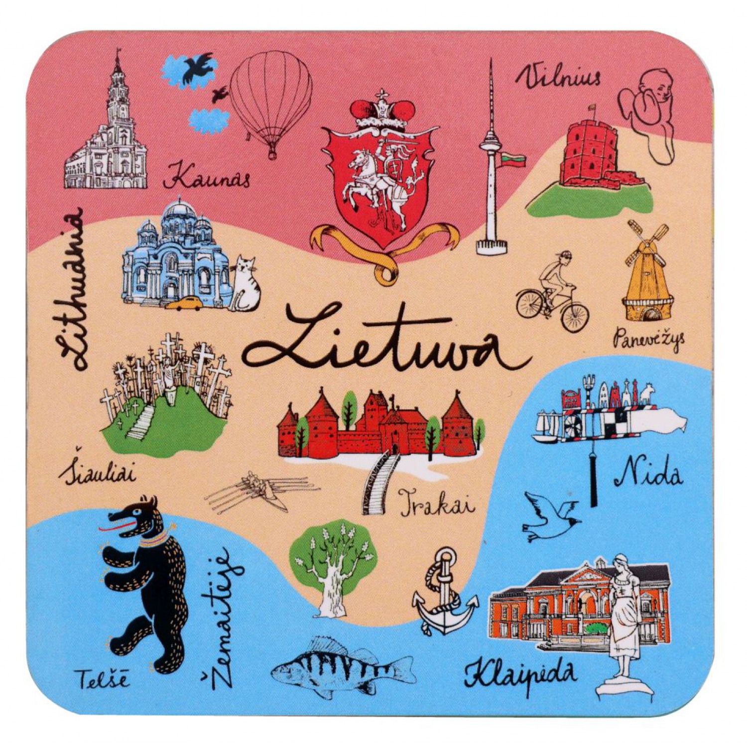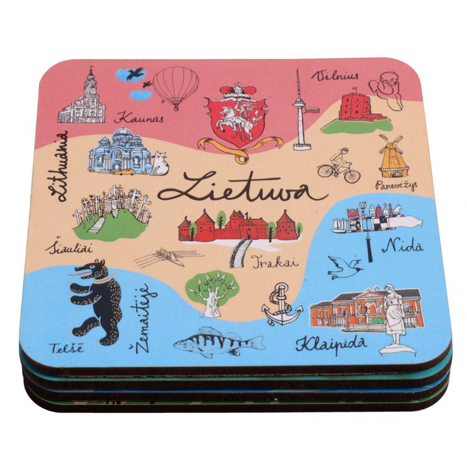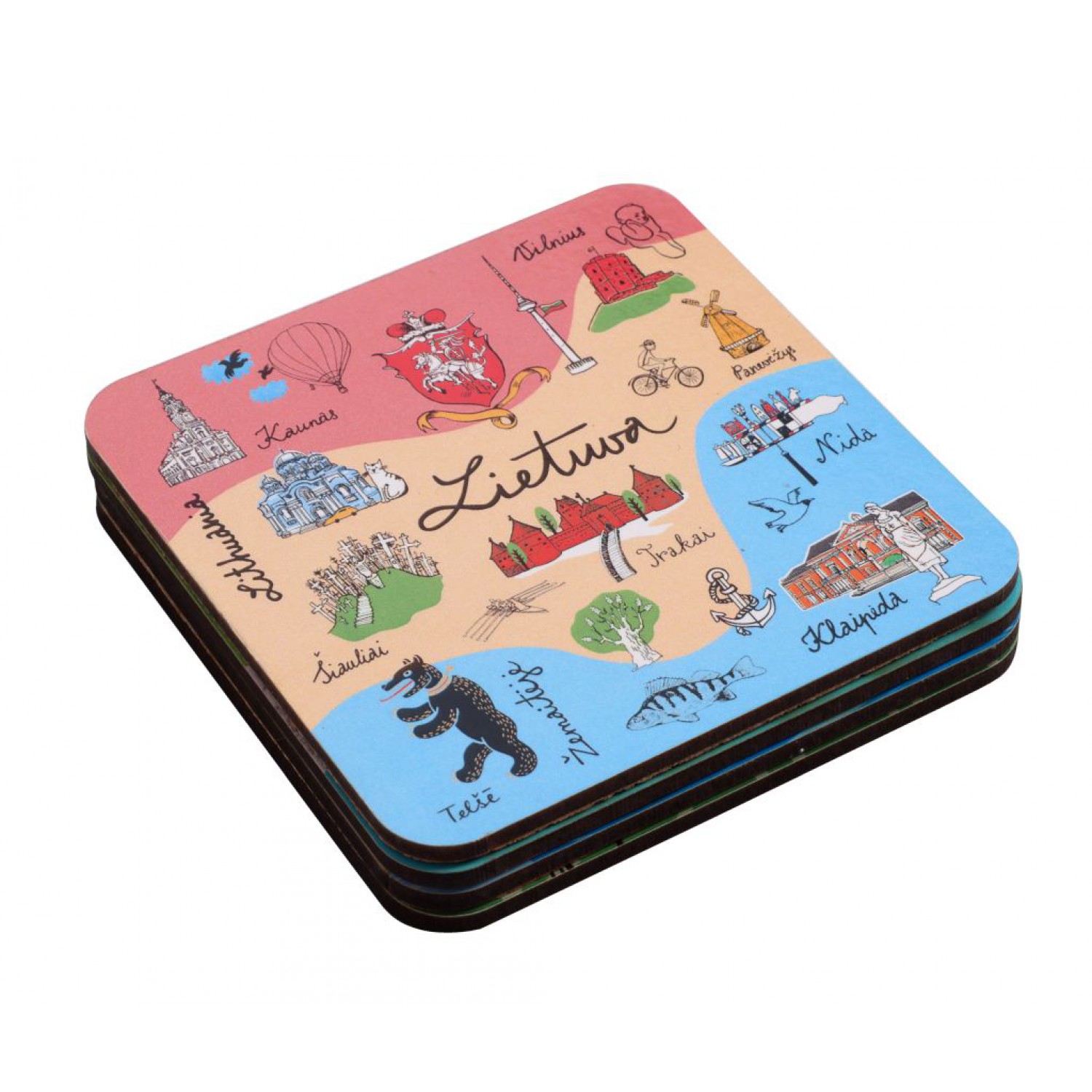 Kamštiniai padėkliukai puodeliams, dekoruoti ryškiais Lietuvos simboliais – miestų architektūra, gamtos elementais ir kultūriniais motyvais. Pagaminti iš natūralios kamštinės medžiagos, lengvi, patvarūs ir apsaugantys paviršius nuo karščio bei drėgmės. Komplekte 4 vienetai.