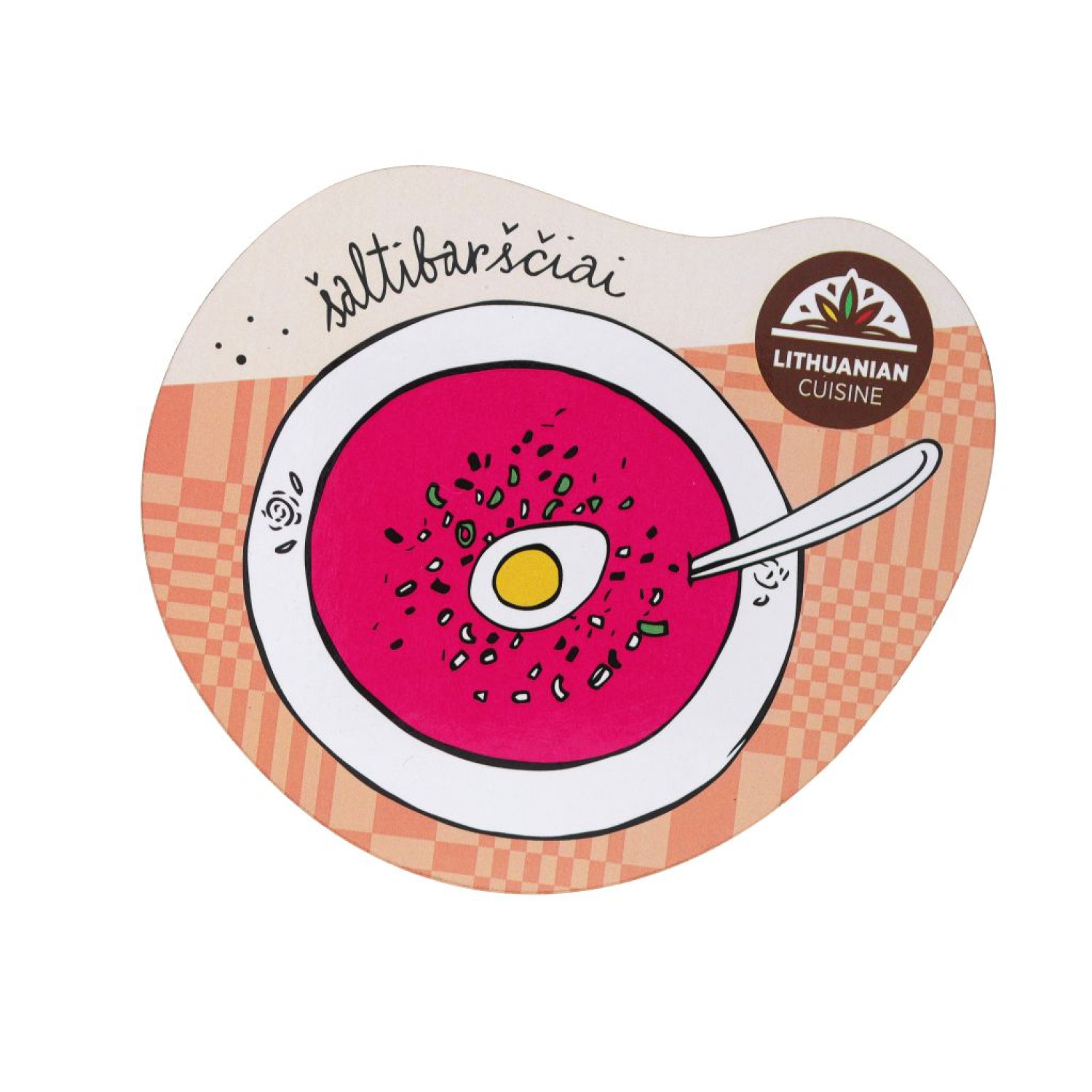 Praktiškas ir stilingas padėkliukas puodeliui, pagamintas iš kokybiškos kamštinės medžiagos. Dekoruotas lietuviško tradicinio patiekalo – šaltibarščių – atvaizdu.