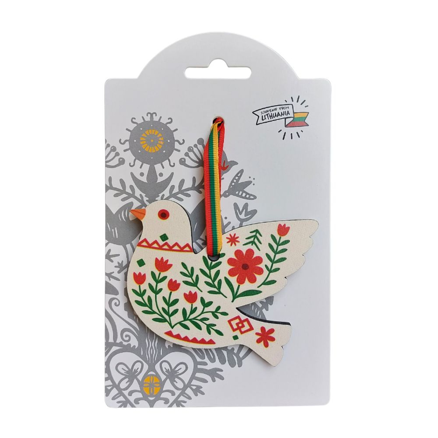 Pakabinama dekoracija Balandis – ryškus ir dailus tautinio stiliaus akcentas jūsų namams ar biurui. Šis dvipusis medinis paukštelis dekoruotas tradiciniais lietuvių liaudies ornamentais. Pakabintas ant trispalvės juostelės, todėl puikiai tinka kaip lietuviškas suvenyras, dovana ar interjero detalė.