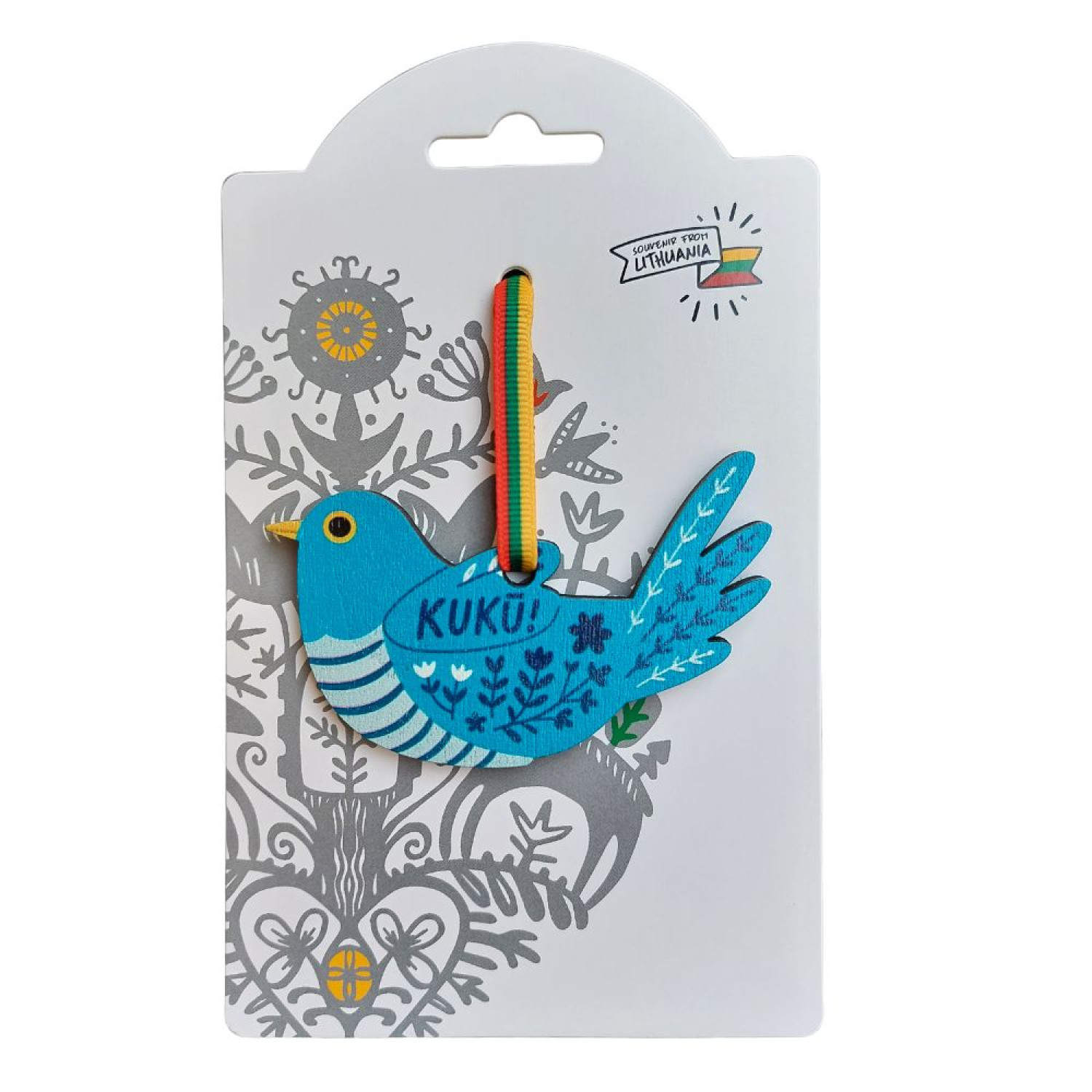 Pakabinama dekoracija paukštelis Gegutė su užrašu - KUKŪ! – žaismingas ir subtilus tautinio stiliaus akcentas jūsų namams ar biurui. Šis dvipusis medinis paukštelis dekoruotas tradiciniais lietuvių liaudies ornamentais. Pakabintas ant trispalvės juostelės, todėl puikiai tinka kaip lietuviškas suvenyras, dovana ar interjero detalė.