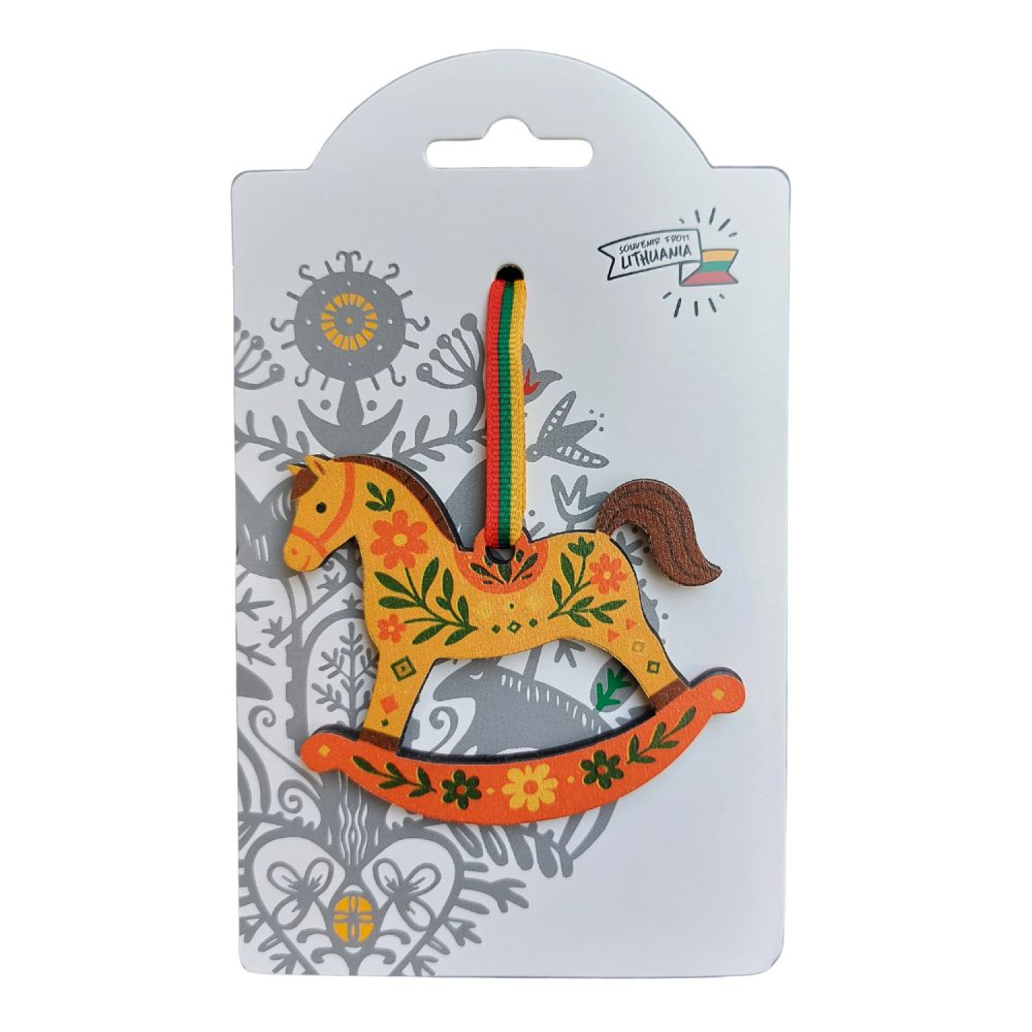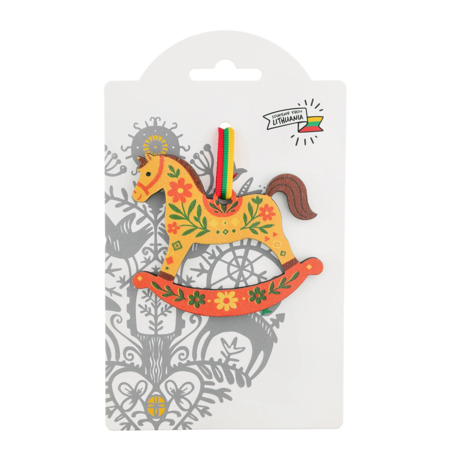 Pakabinama dekoracija supamas arkliukas – mielas ir spalvingas tautinio stiliaus akcentas, tinkantis tiek vaikų kambariui, tiek kaip simbolinis suvenyras. Šis dvipusis medinis arkliukas dekoruotas lietuvių liaudies ornamentais.