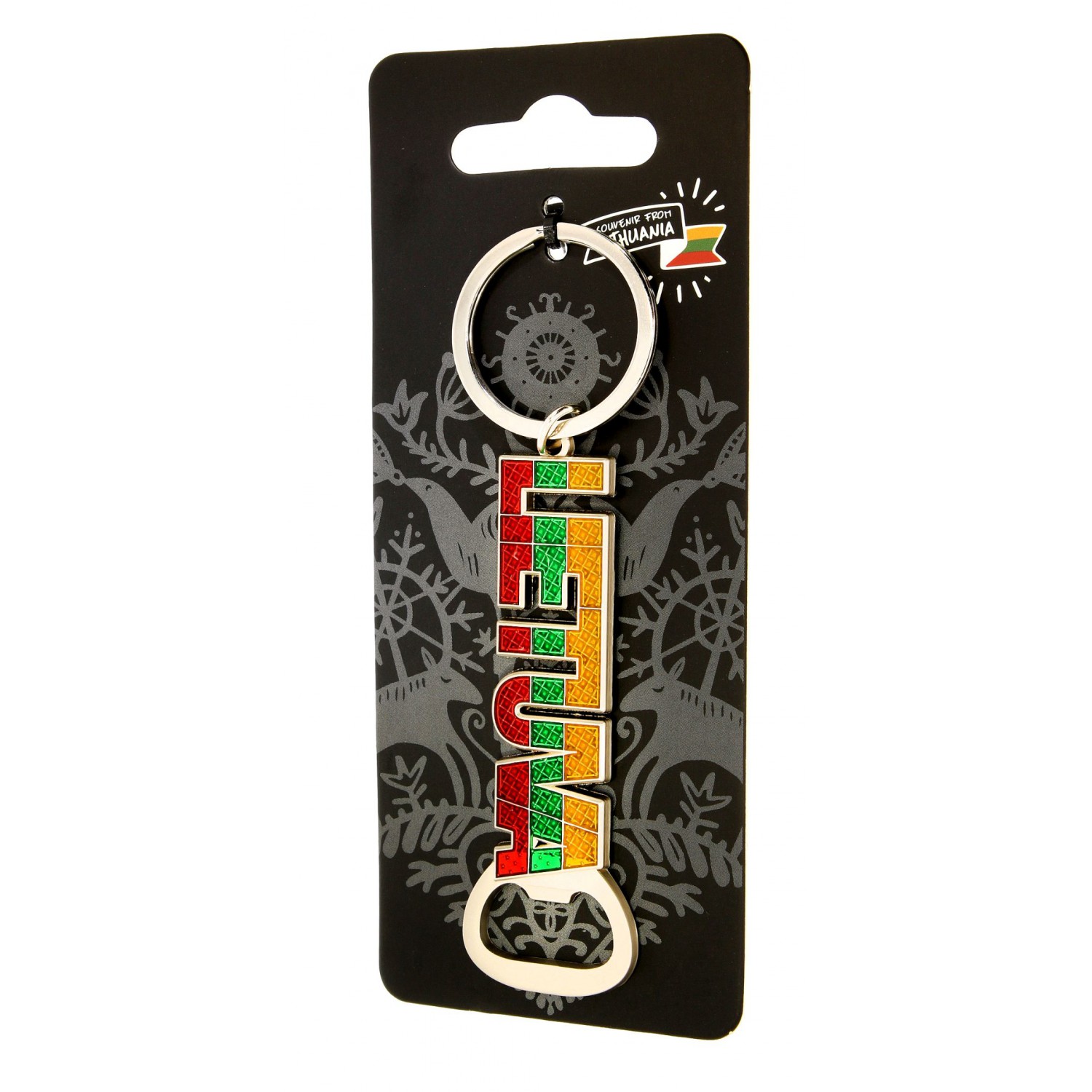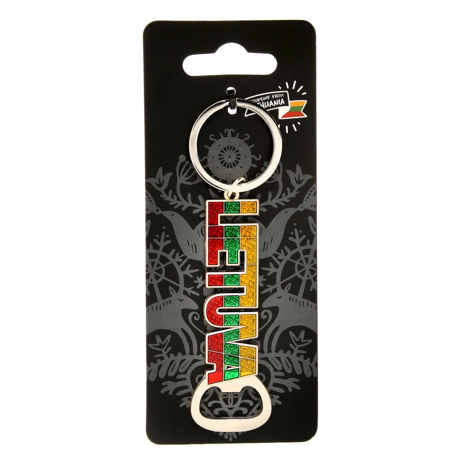 Spalvingas metalinis raktų pakabukas su užrašu Lietuva su Lietuvos vėliavos spalvomis. Apatinėje dalyje integruotas funkcionalus butelių atidarytuvas.