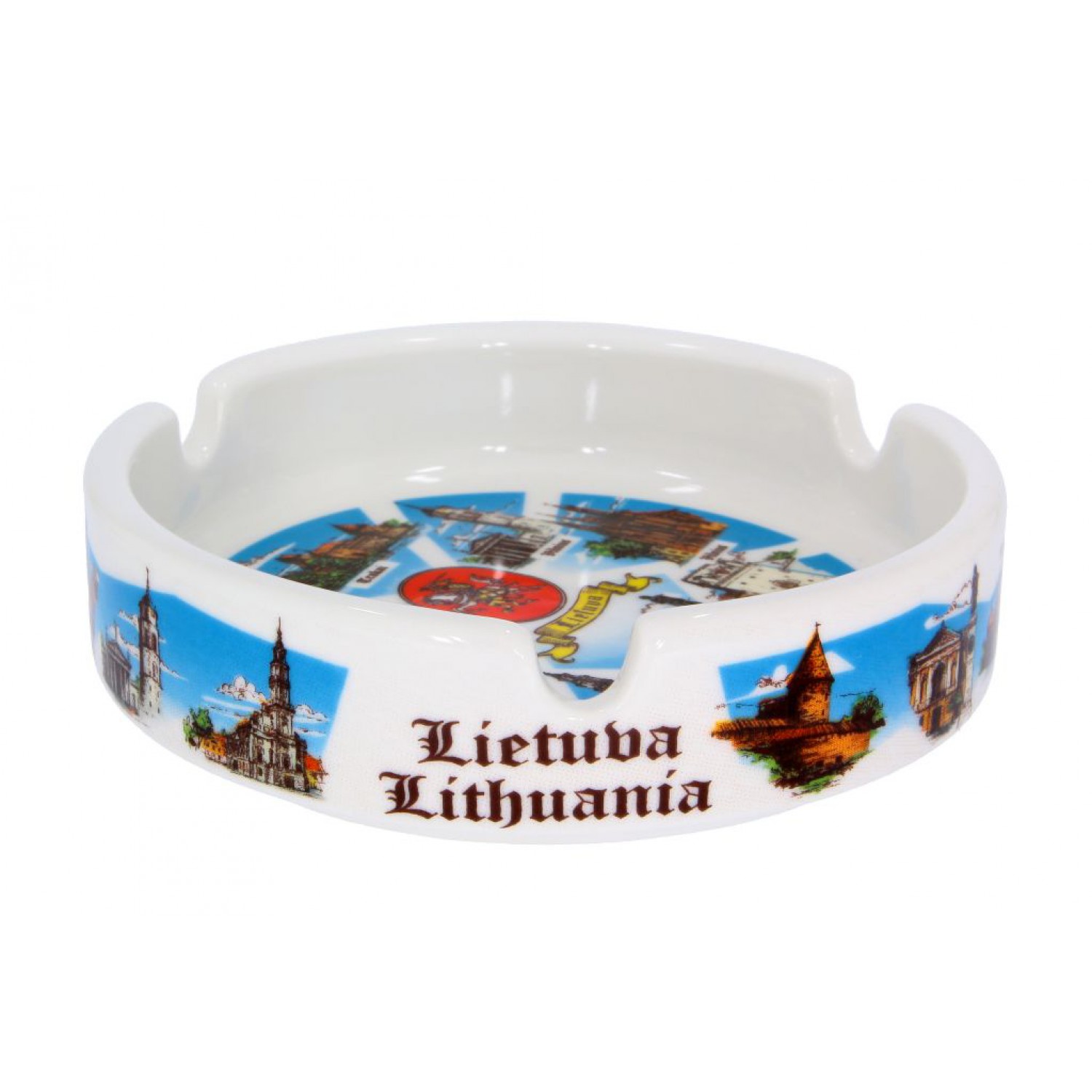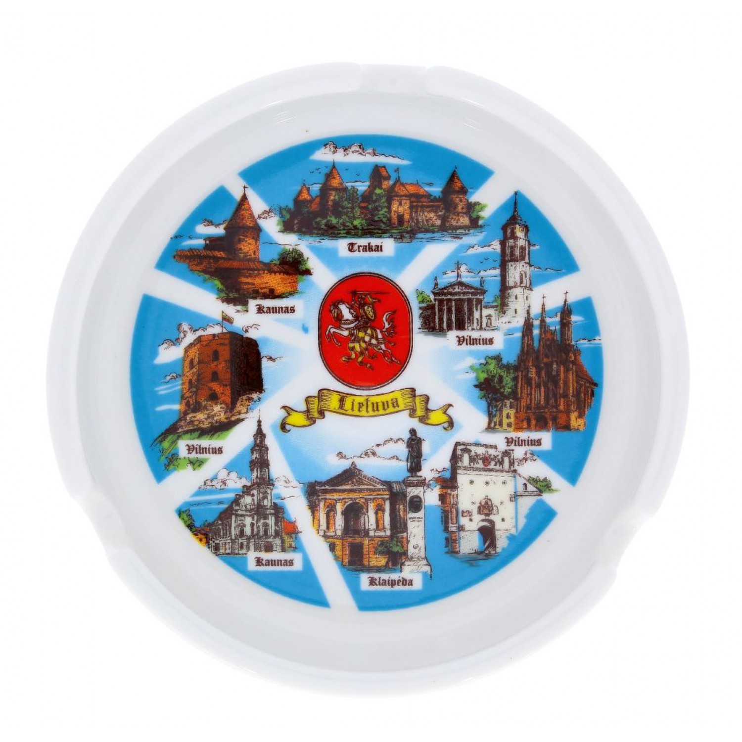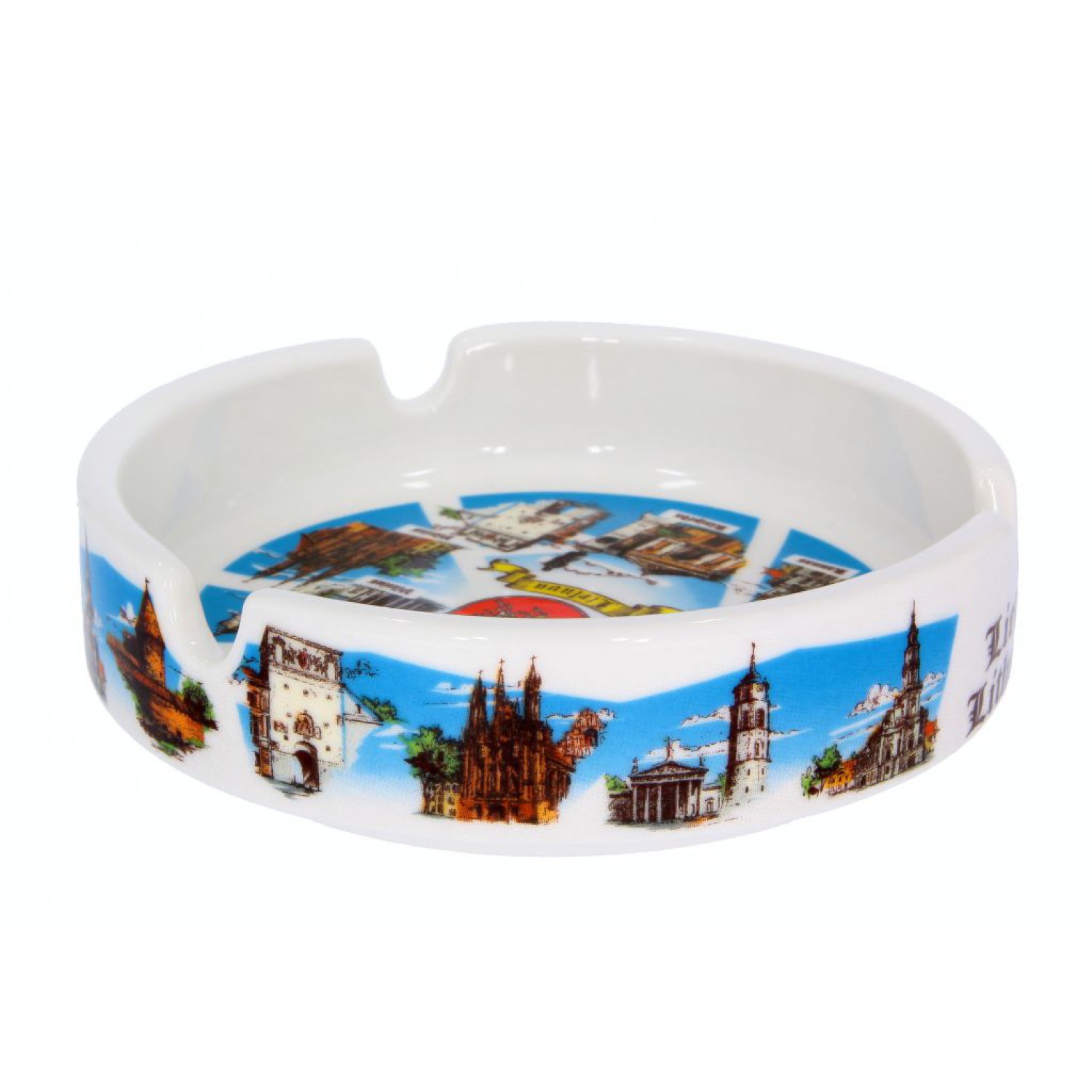 Porcelianinė baltos spalvos peleninė, dekoruota Lietuvos miestų pastatų vaizdais. Išskirtinis suvenyras, puikiai tinkantis namų interjerui arba kolekcijai.