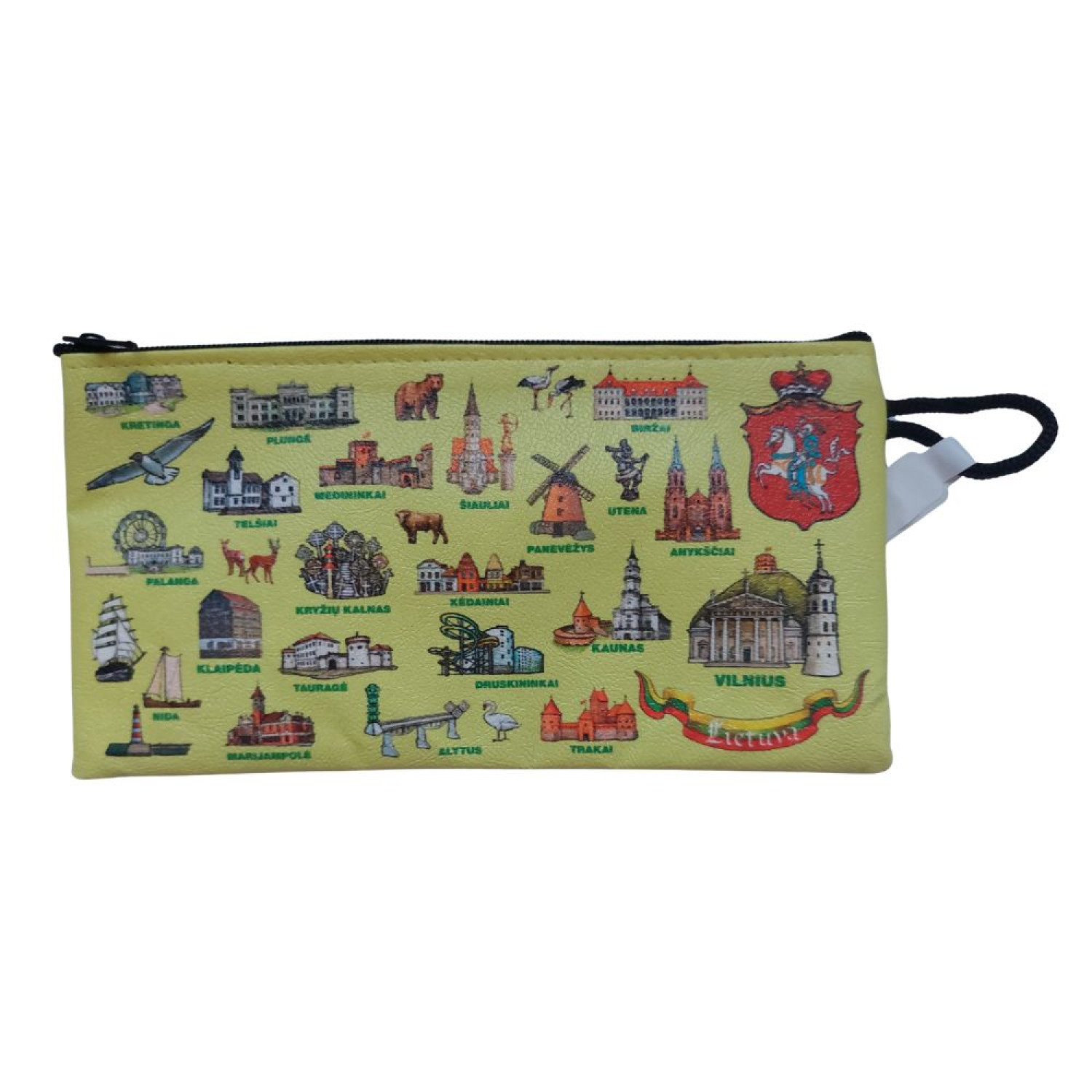 Stilingas ir praktiškas penalas – kosmetinė su Lietuvos žemėlapiu ir žymiausių miestų simboliais. Puikiai tinka laikyti rašymo priemones, kosmetiką ar smulkius daiktus. Patogi užtrauktuko užsegimo sistema, kompaktiškas dydis – puikus suvenyras ar dovana Lietuvos mylėtojams.