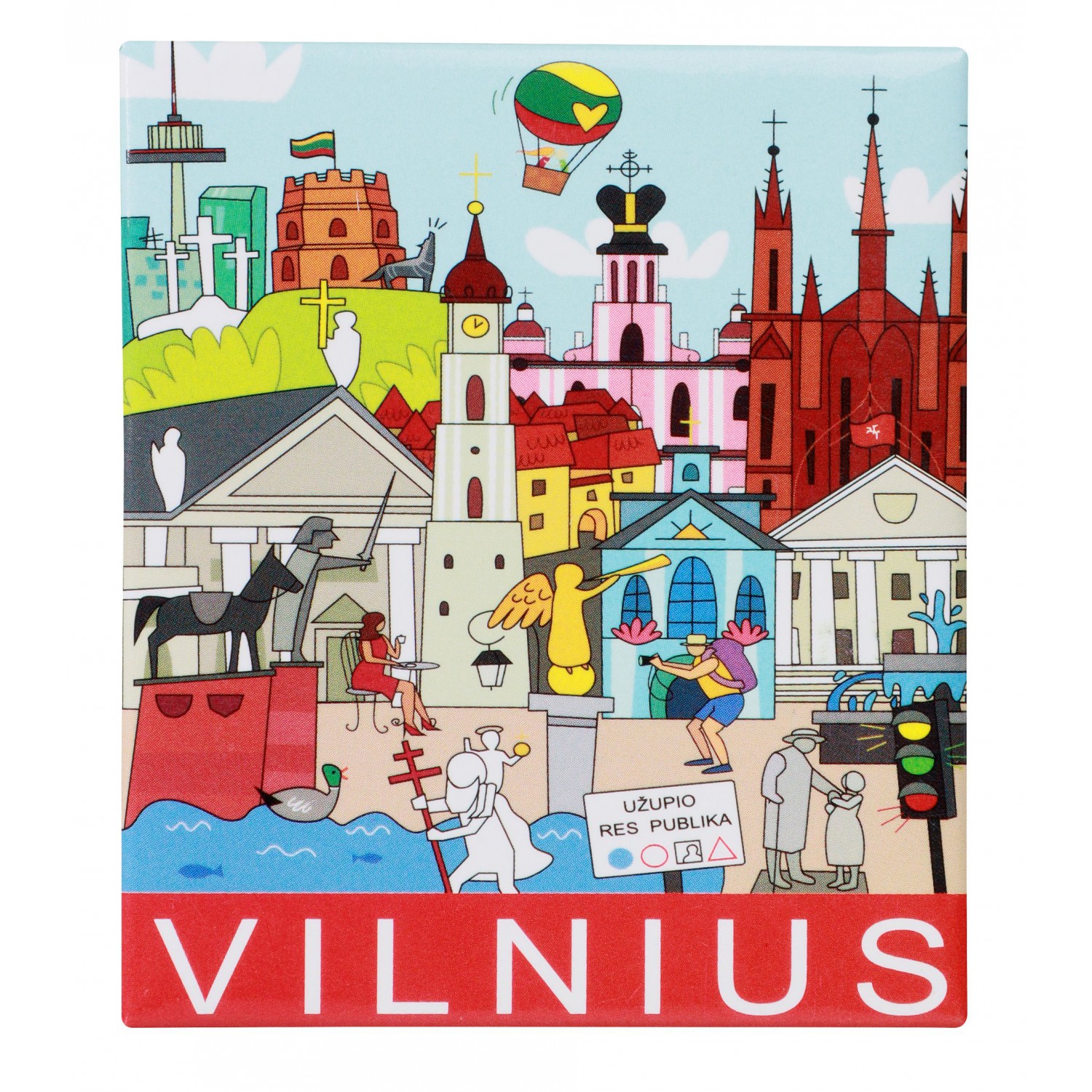 Spalvingas pieštinis suvenyrinis magnetas su garsiausiais Vilniaus objektais: Gedimino pilimi, Vilniaus katedra, Užupiu, Šv. Onos bažnyčia ir kitais sostinės simboliais. Puiki dovana ar prisiminimas iš Lietuvos sostinės.