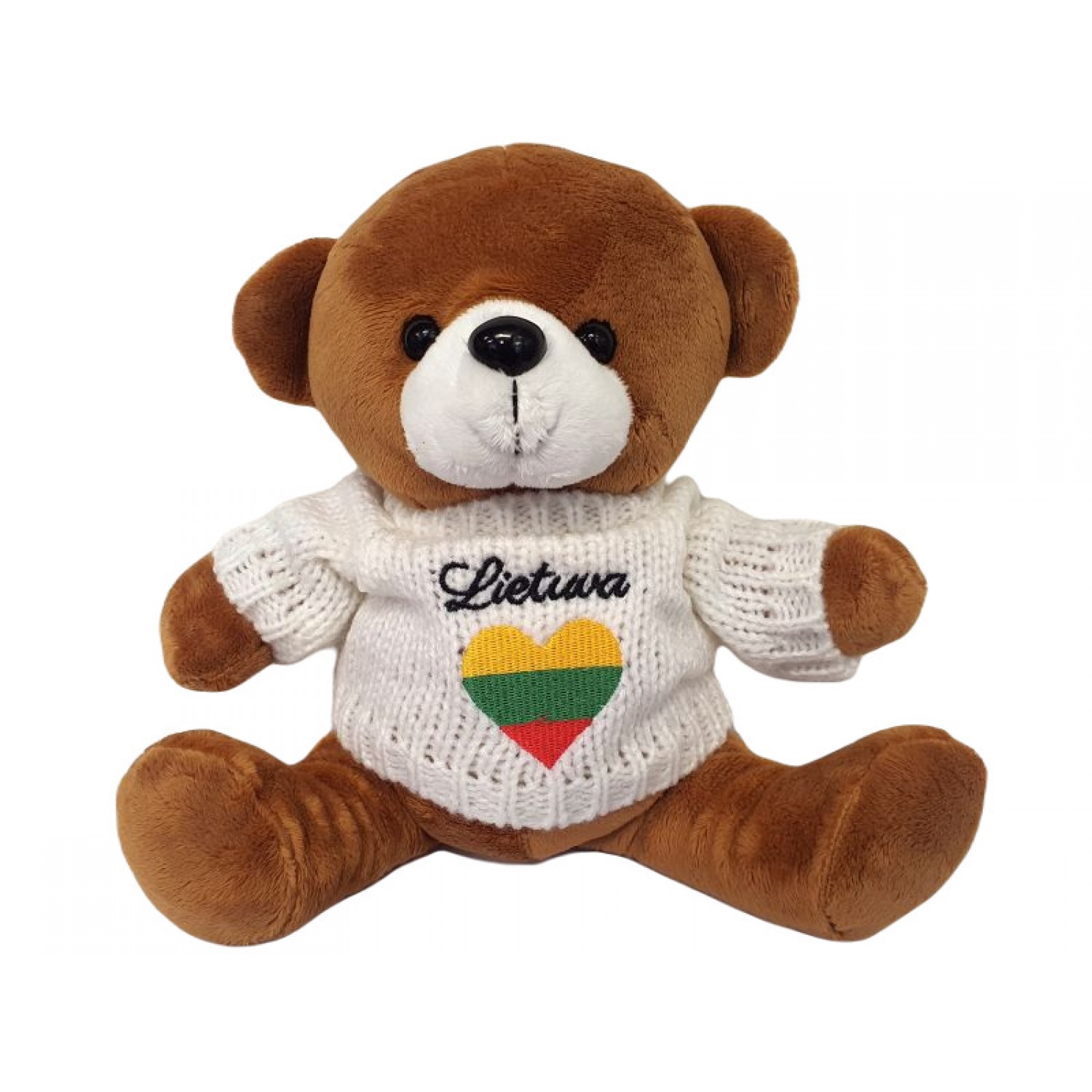Minkštas pliušinis meškiukas dėvi baltą megztinį, ant kurio siuvinėta Lietuvos trispalvės širdelė ir užrašas Lietuva. Aukštos kokybės suvenyras, puikiai tinkantis suvenyrų parduotuvėms.