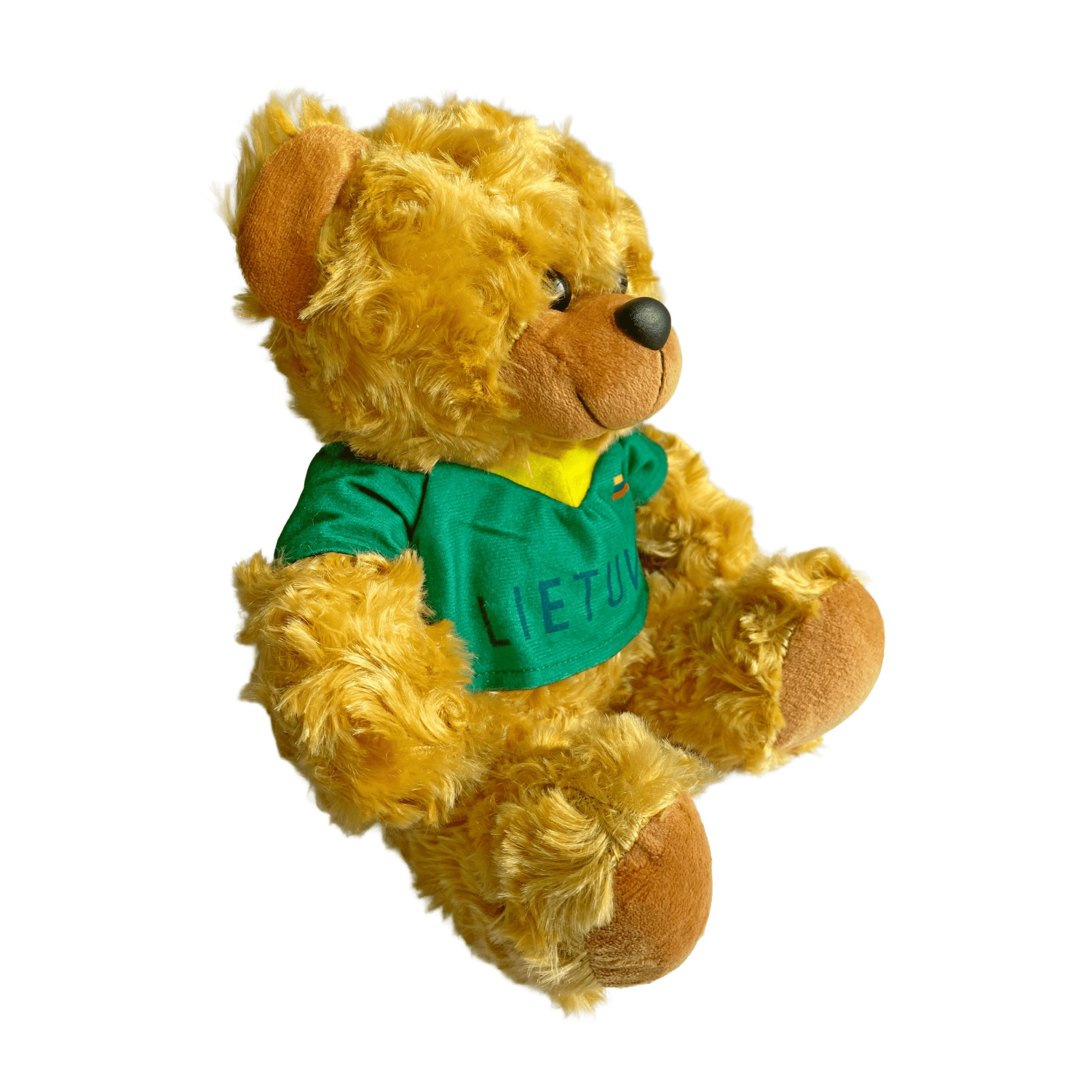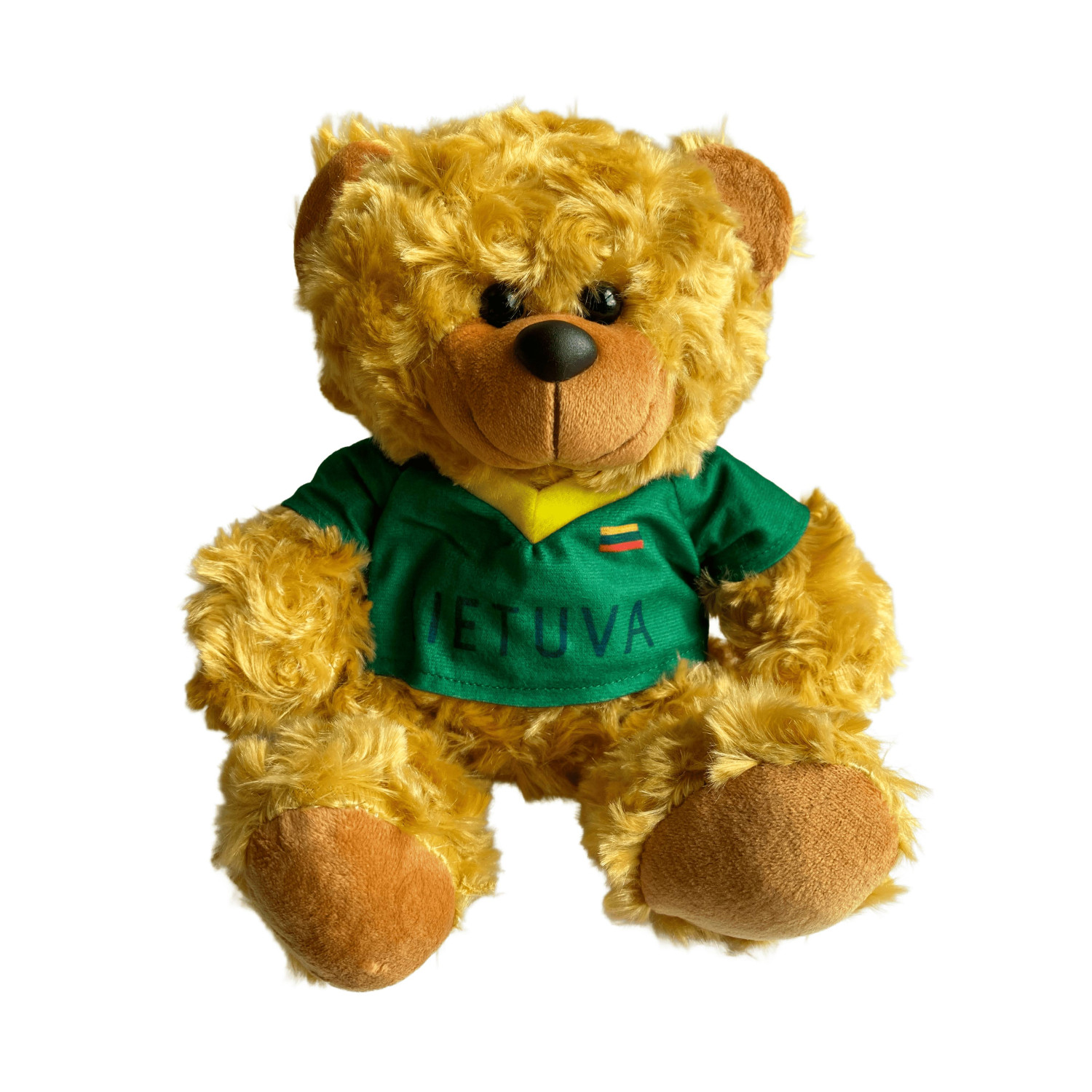 Minkštas, rudos spalvos pliušinis meškiukas vilki žalius sirgalių marškinėlius, papuoštus užrašu Lietuva ir Lietuvos vėliava. Tai kokybiškas ir žaismingas suvenyras, puikiai tinkantis sporto sirgaliams bei suvenyrų parduotuvėms.