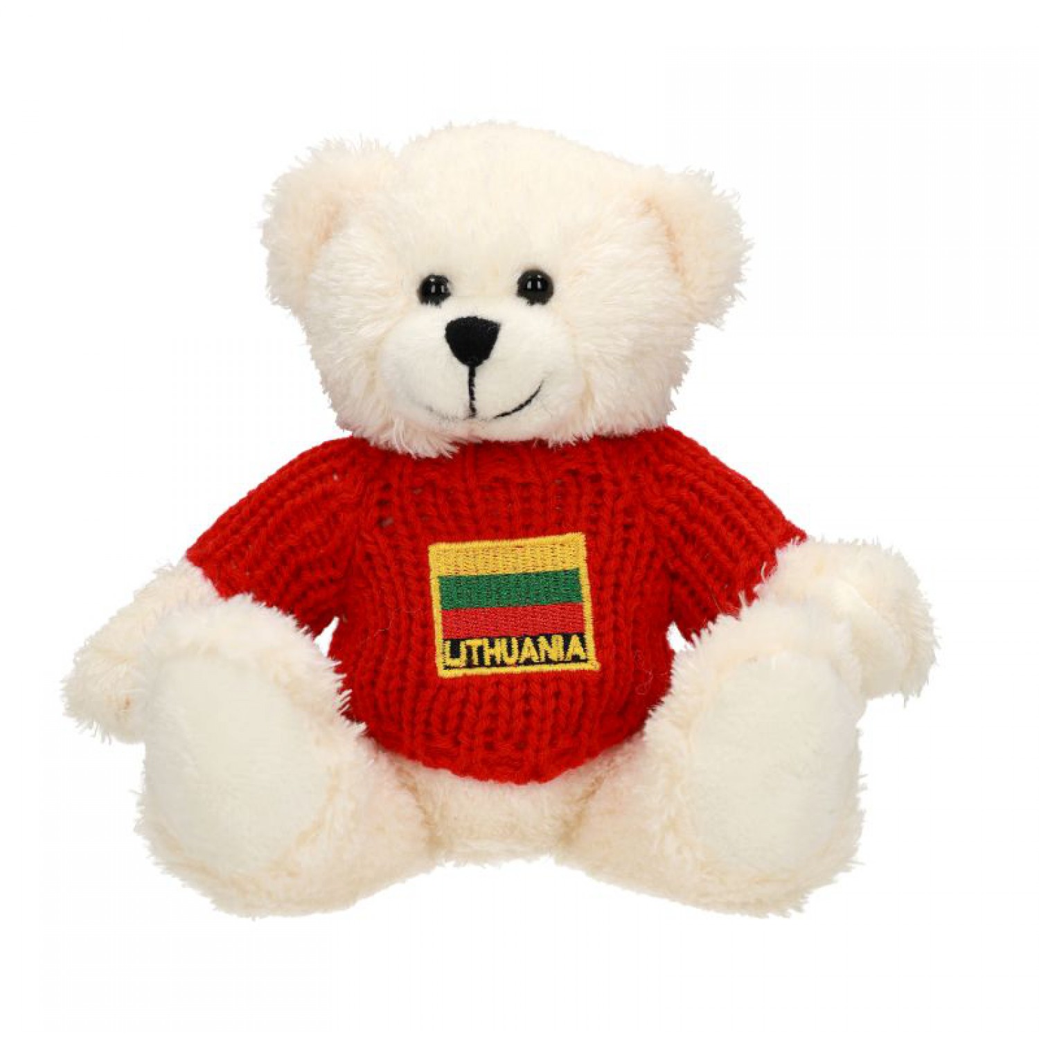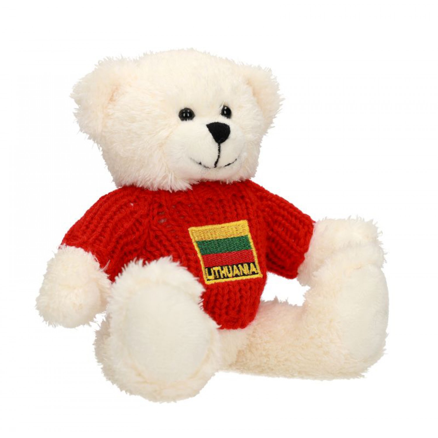 Švelnus ir mielas pliušinis meškutis vilki raudoną megztuką, dekoruotą išsiuvinėta Lietuvos trispalve ir užrašu Lithuania. Tai kokybiškas ir simbolinis lietuviškas suvenyras, tinkantis įvairaus amžiaus pirkėjams. Puikus pasirinkimas suvenyrų parduotuvėms ieškančioms originalių ir mielų prekių su Lietuvos atributika.