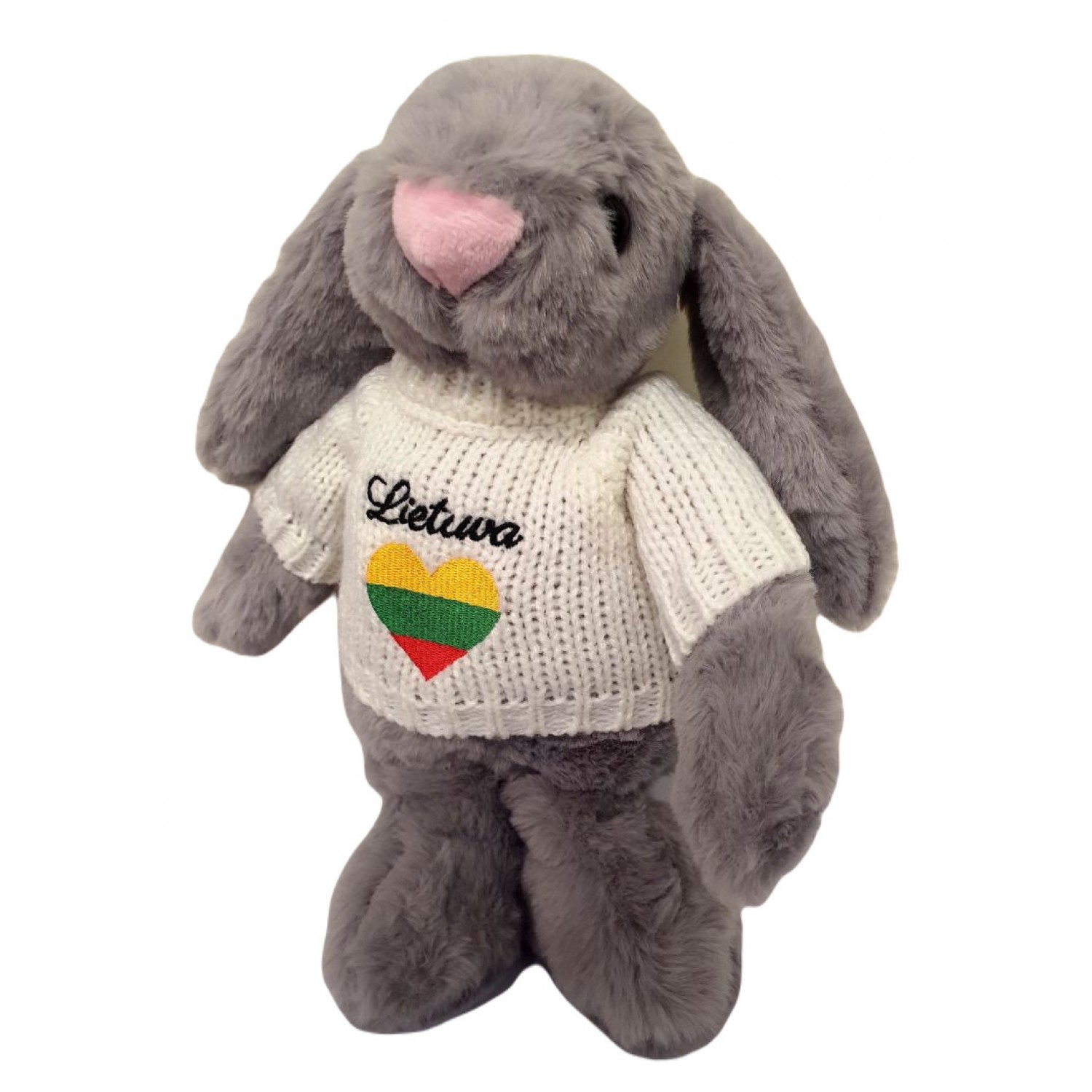 Minkštas pliušinis triušis dėvi baltą megztinį, puoštą išsiuvinėta Lietuvos trispalve širdelės forma ir užrašu Lietuva. Šis aukštos kokybės suvenyras puikiai tinka suvenyrų parduotuvėms.
