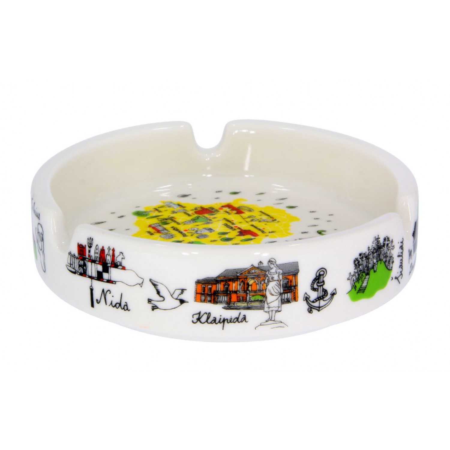 Baltos spalvos porcelianinė suvenyrinė peleninė, dekoruota Lietuvos žemėlapiu ir miestais. Estetiška ir funkcionali detalė, tinkanti namų dekorui ar kolekcijai.