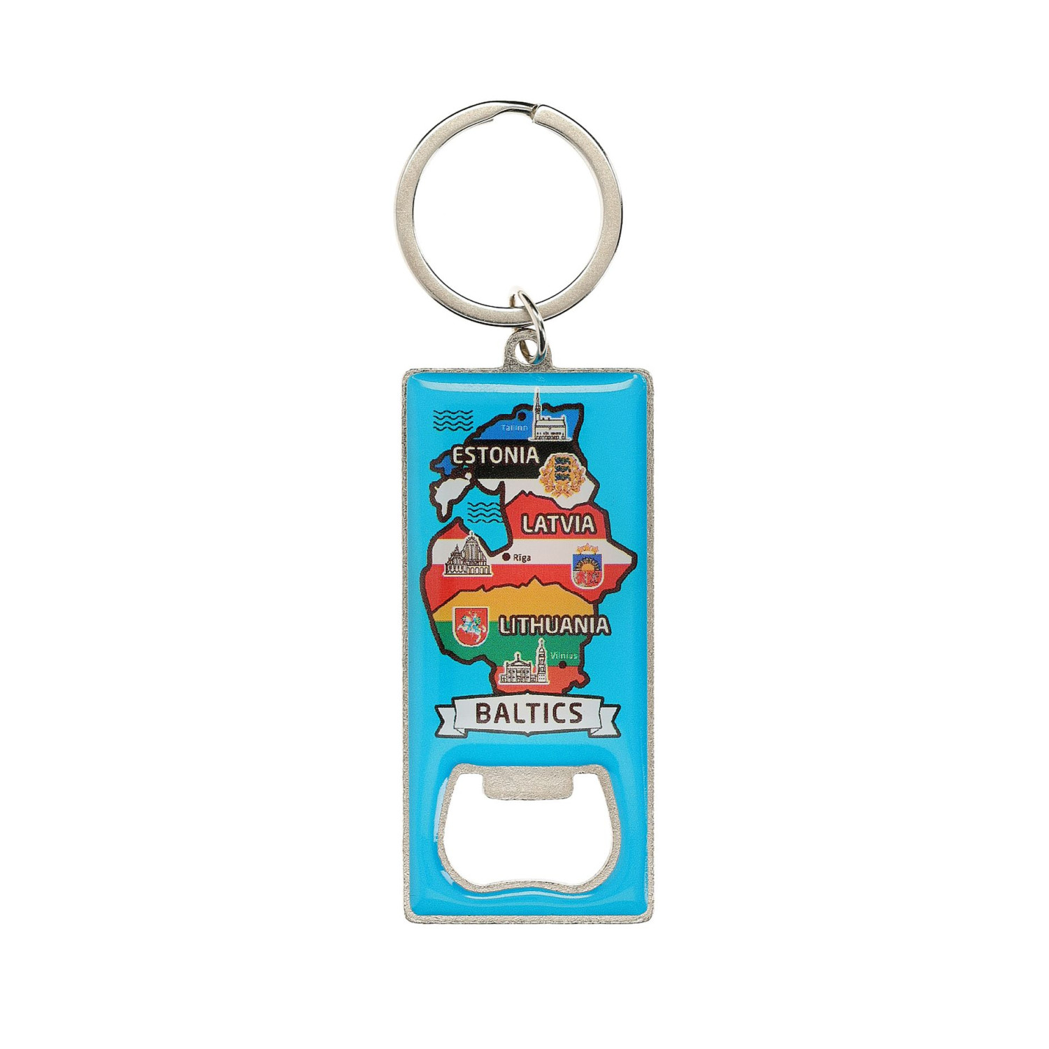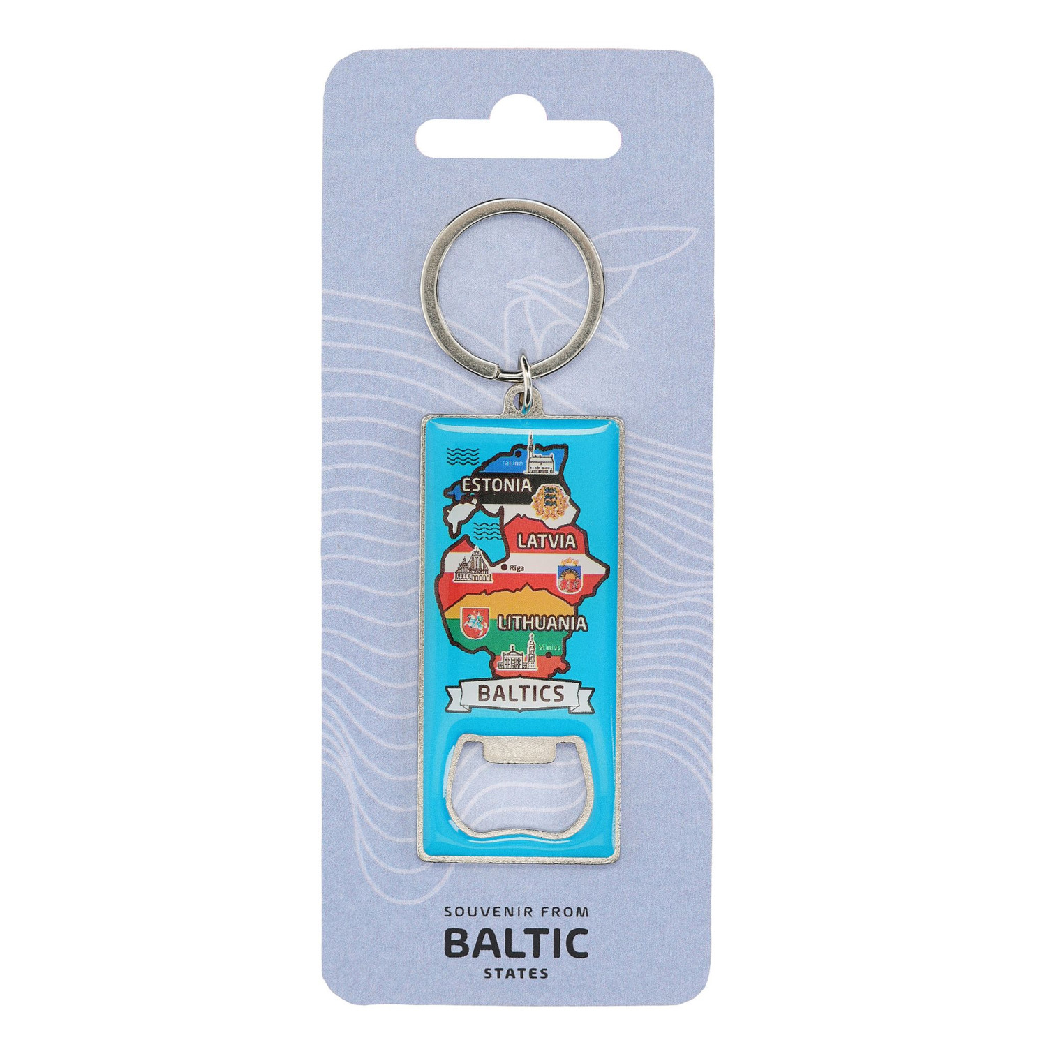 Metalo raktų pakabukas–atidarytuvas su spalvingu Baltijos šalių žemėlapiu. Talinas, Ryga ir Vilnius pavaizduoti su sostinių simboliais. Kompaktiškas, ryškus ir praktiškas suvenyras su epoksidiniu sluoksniu.