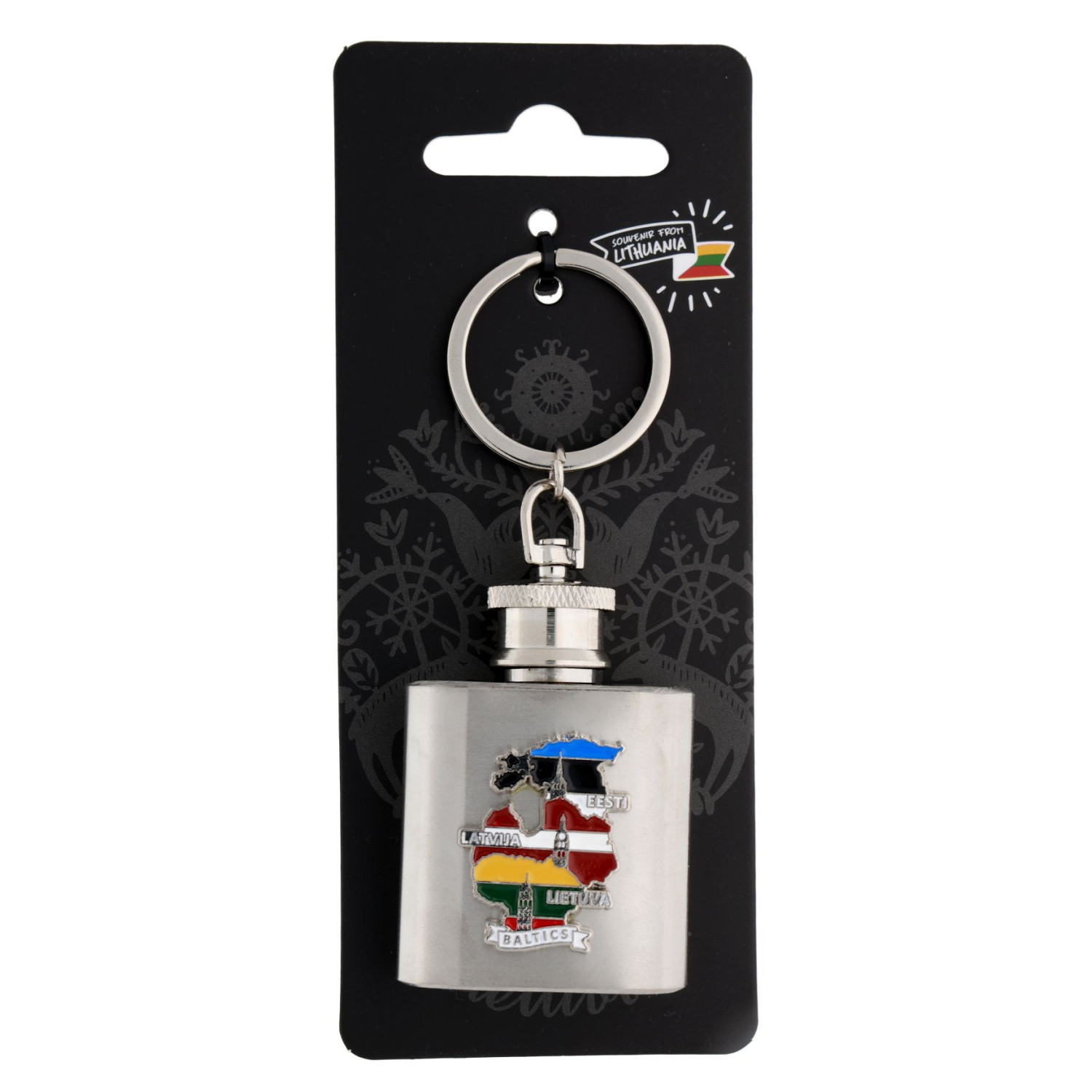 Metalinis raktų pakabukas gertuvės formos, dekoruotas Baltijos šalių kontūru su jų vėliavų spalvomis. Stilingas ir praktiškas aksesuaras, tinkamas prekybai.