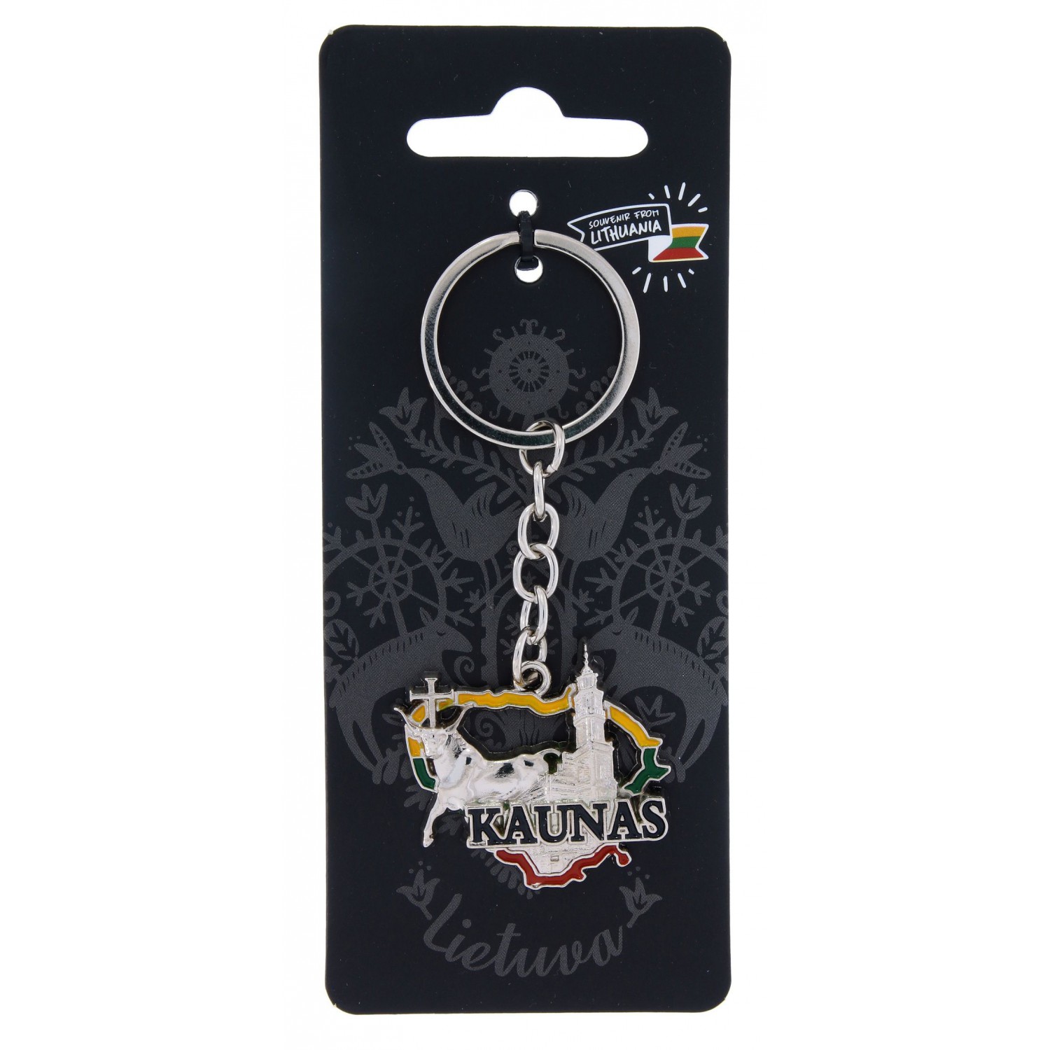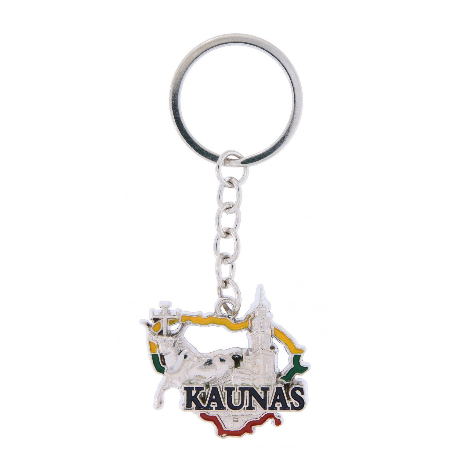 Metalinis raktų pakabukas su Kauno miesto simbolika – Rotušės bokštu, Tauro figūra ir Lietuvos kontūru su trispalve. Spalvingas ir reprezentatyvus suvenyras, tinkantis mažmeninei prekybai.