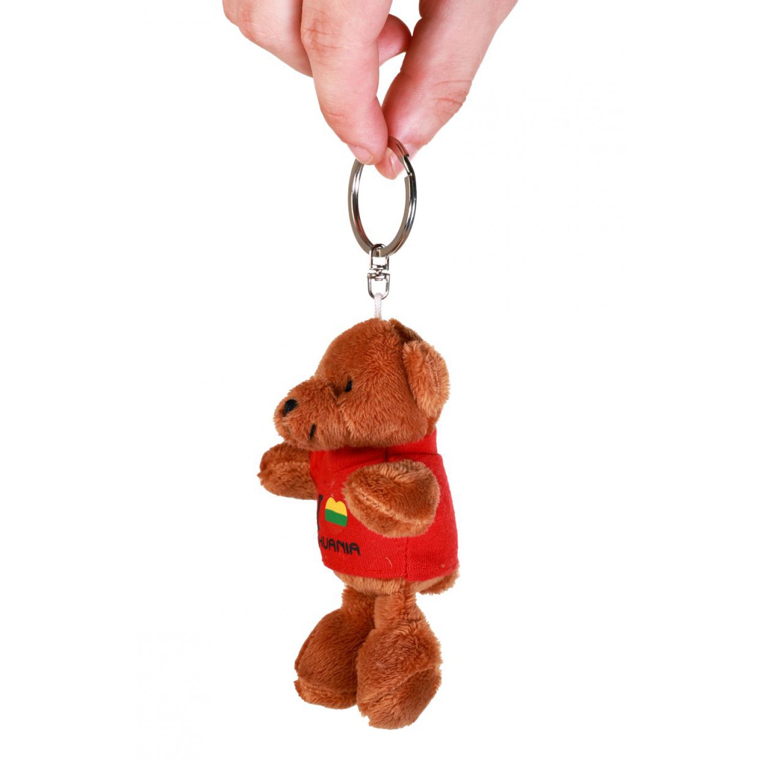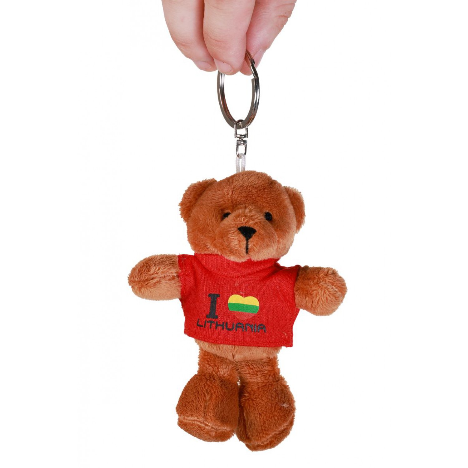 Mielas pliušinis raktų pakabukas – meškutis su raudonais marškinėliais ir užrašu I Love Lithuania. Puikus pasirinkimas kaip suvenyras ar aksesuaras kuprinei ar raktams.