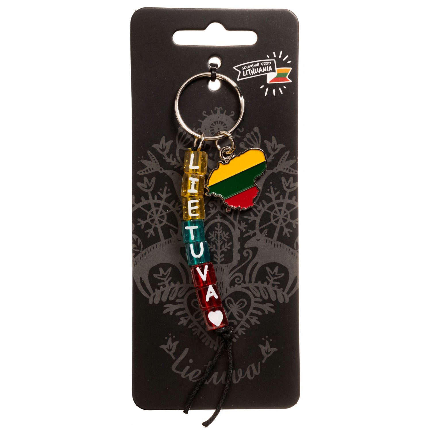 Spalvotų kubelių raktų pakabukas su vertikaliu užrašu LIETUVA, sudėliotu Lietuvos vėliavos spalvomis. Papuoštas metaliniu Lietuvos kontūru trispalvėje. Lengvas, žaismingas ir patriotiškas aksesuaras.
