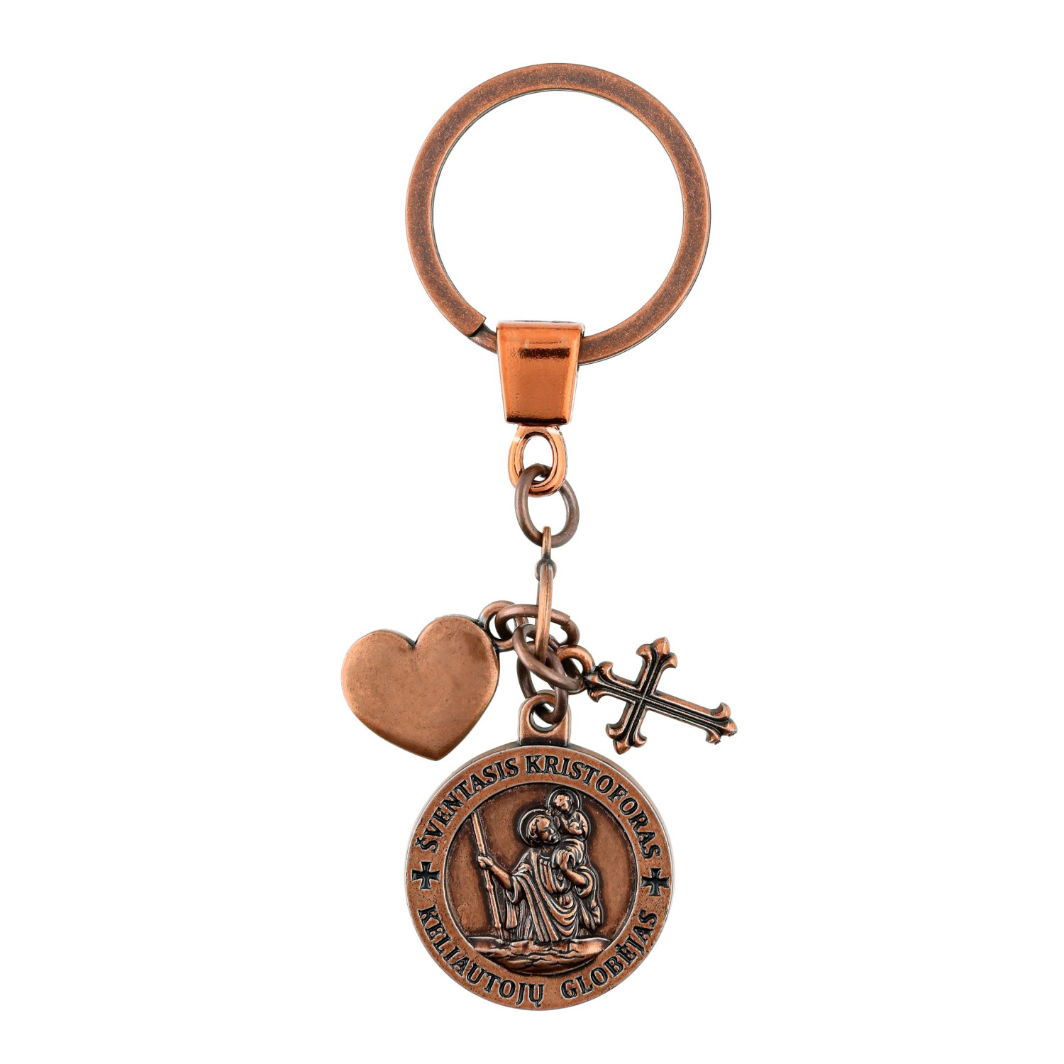 Stilingas metalinis raktų pakabukas su Šventojo Kristoforo, keliautojų globėjo, atvaizdu ir kryželiu. Ant širdelės graviruotas žodis Draugui. Puiki dovana keliaujantiems ar brangiam draugui.