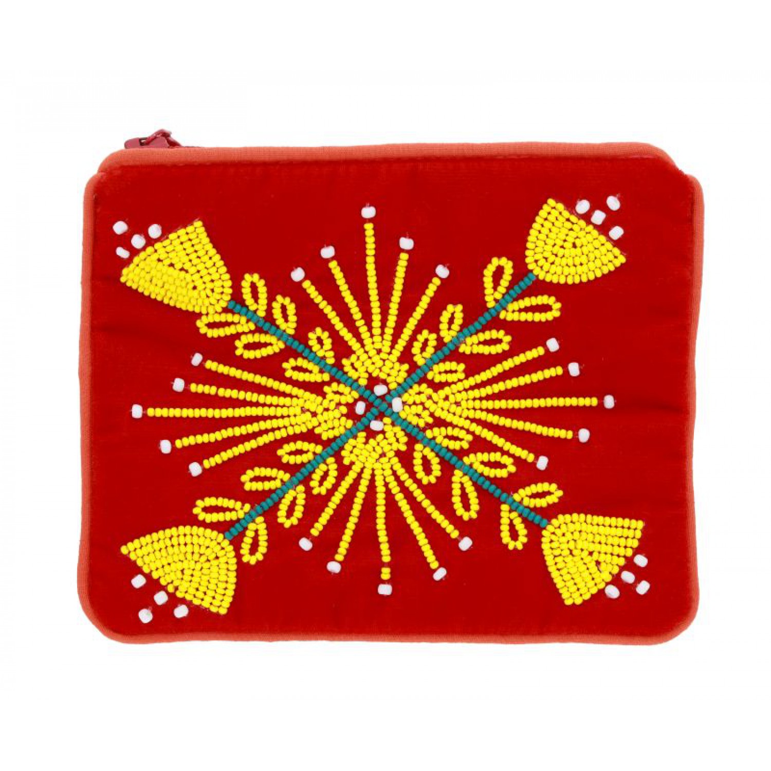 Raudonos spalvos veliūrinė kosmetinė, dekoruota rankomis išsiuvinėtais lietuviškais raštais iš karoliukų. Autentiškas lietuviškas suvenyras, kuris puikiai tiks tiek kasdieniam naudojimui. Užsegama užtrauktuku.