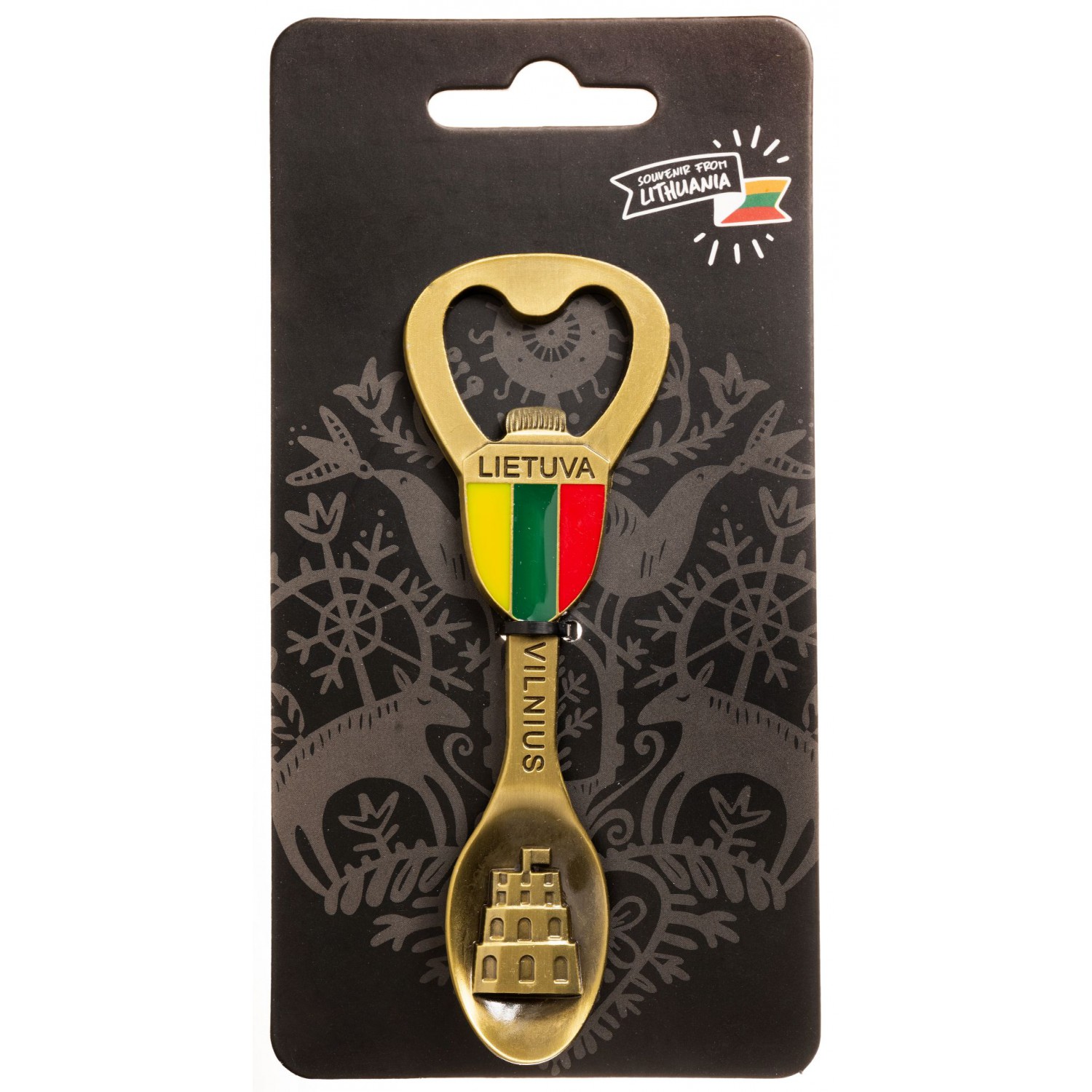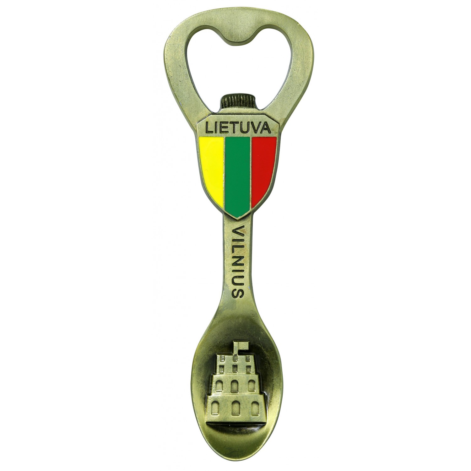 Suvenyrinis metalinis magnetas atidarytuvas, šaukštelio formos, bronzos spalvos. Šaukštelyje pavaizduotas Gedimino pilies bokštas, Lietuvos trispalvė bei užrašai Lietuva ir Vilnius. Originalus ir praktiškas suvenyras, tinkamas prekybai.