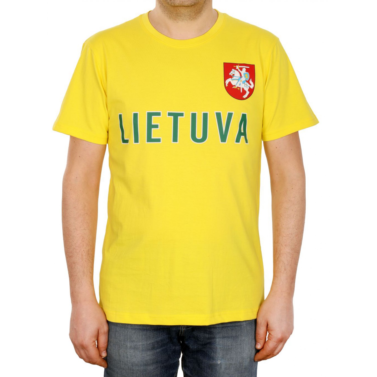 Geltoni trumpomis rankovėmis marškinėliai sirgaliams, priekyje užrašas Lietuva ir Lietuvos herbas. Unisex modelis – patogus pasirinkimas sporto renginiams ar kasdieniam nešiojimui.