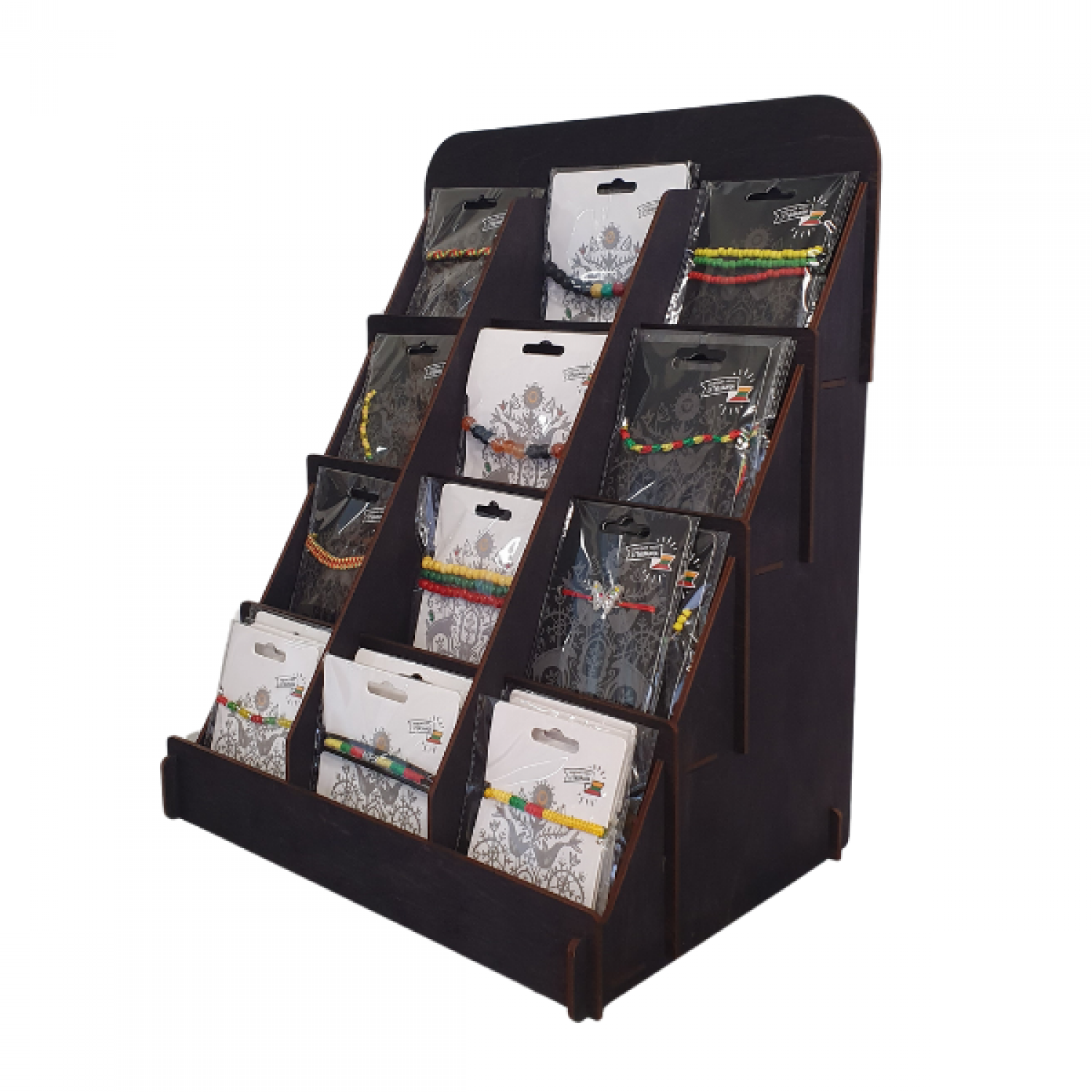 Juodos spalvos stendas iš feneros, skirtas apyrankių, ženkliukų ir kitų smulkių prekių eksponavimui. Tinka FROM.lt asortimentui.