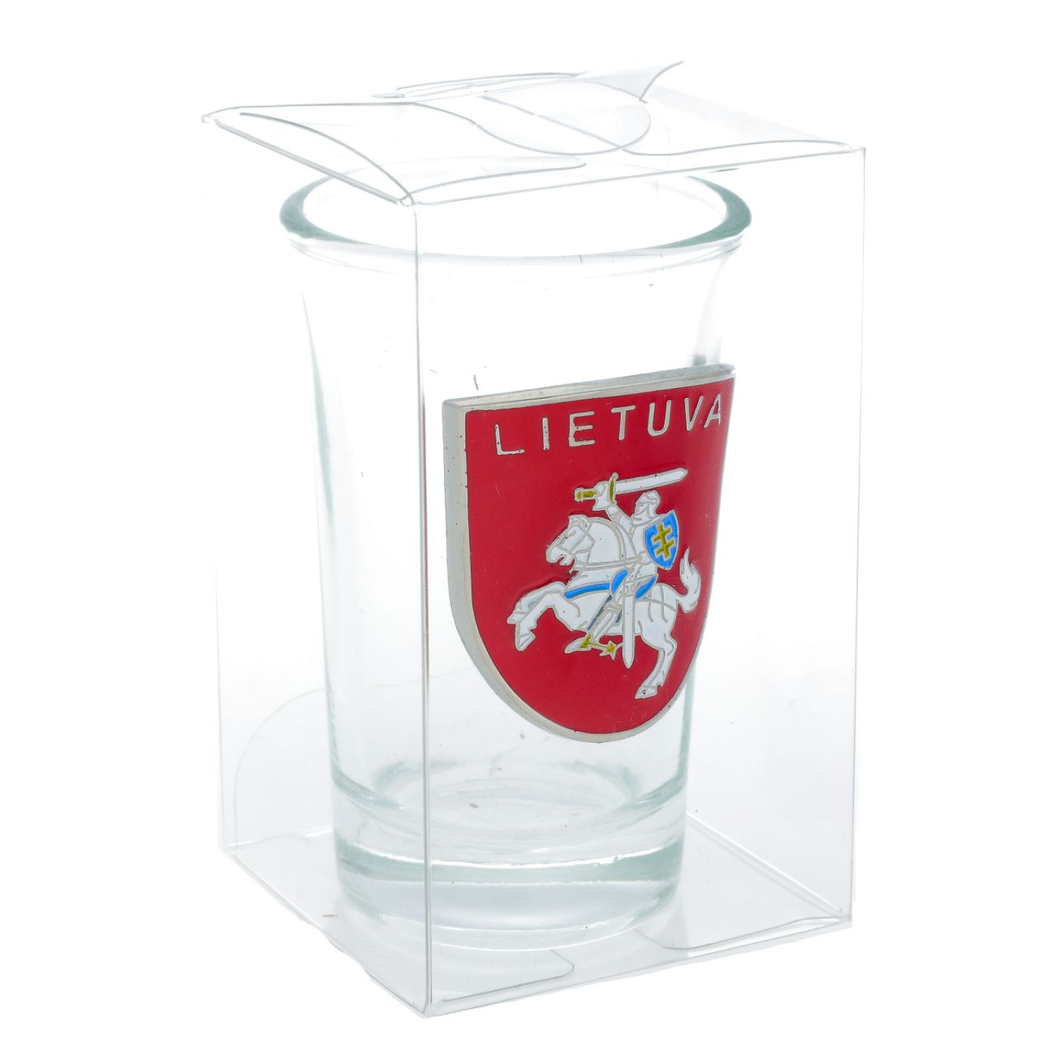 Skaidraus stiklo stikliukas dekoruotas metaline detale – ryškiai raudonu Lietuvos herbu ir užrašu Lietuva. Praktinis suvenyras, puikiai tinkantis prekybai suvenyrais.