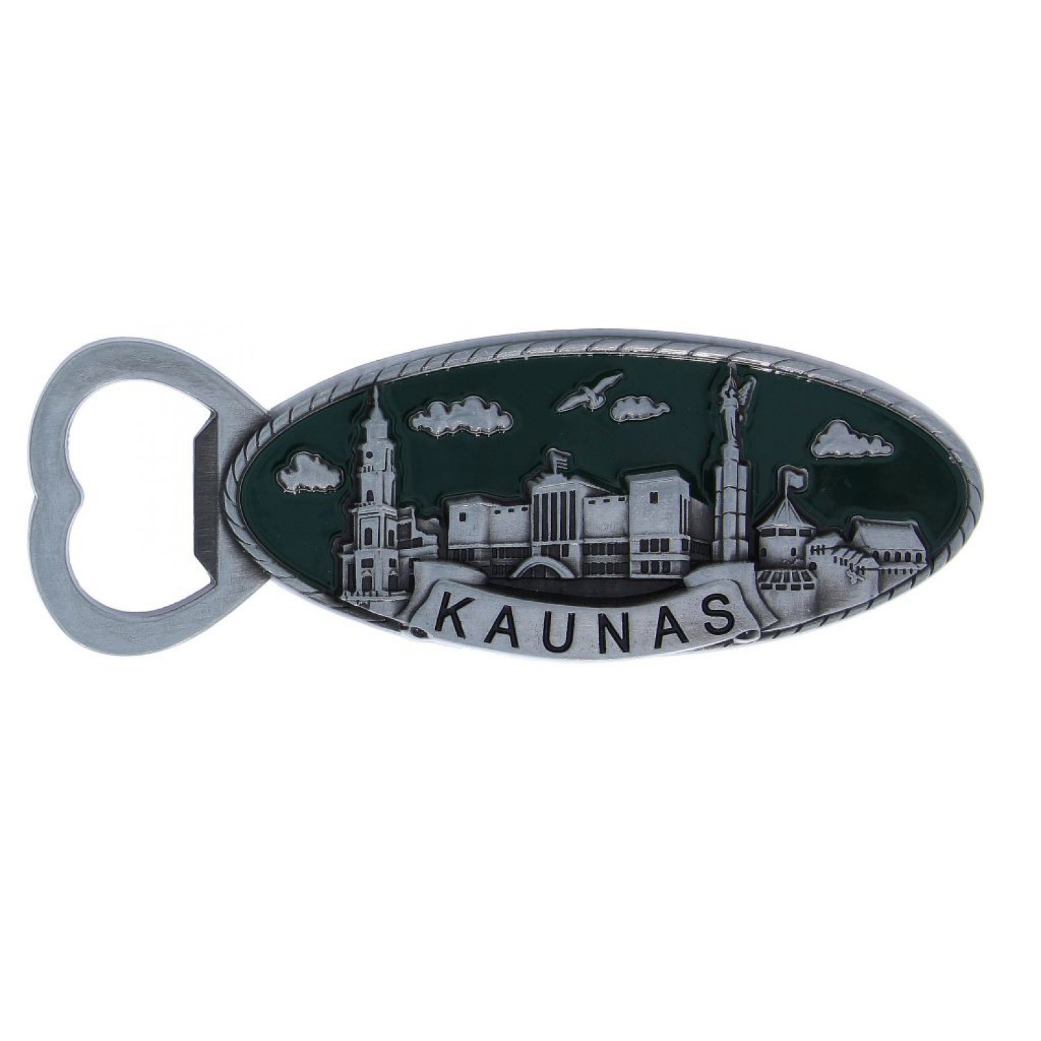 Metalinis, ovalo formos suvenyrinis magnetas atidarytuvas su tamsiai žalios spalvos fonu ir Kauno lankytinų vietų vaizdu. Patvarus, praktiškas ir puikiai tinkantis prekybai.