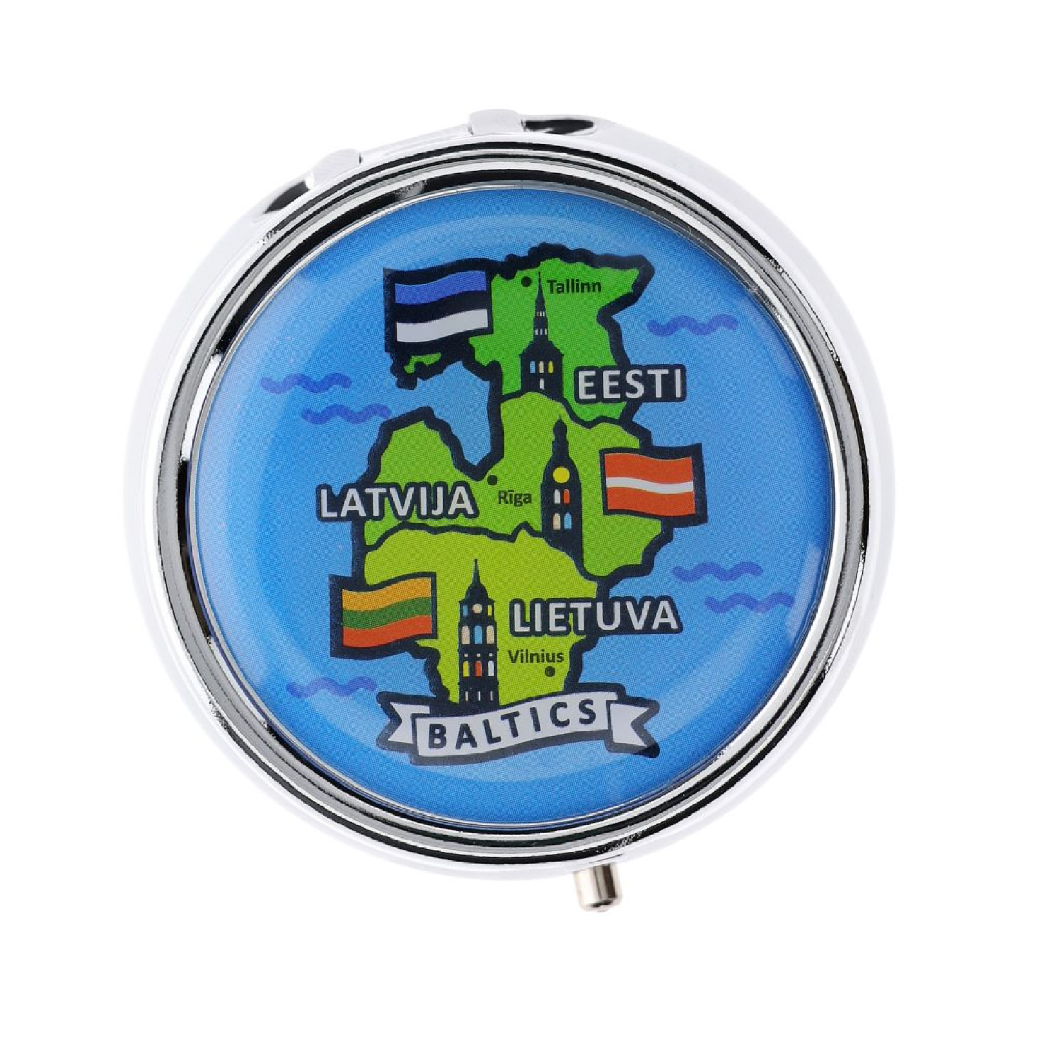 Suvenyrinė dėžutė vaistams su Baltijos šalių kontūrų dekoru. Patogi ir praktiška.