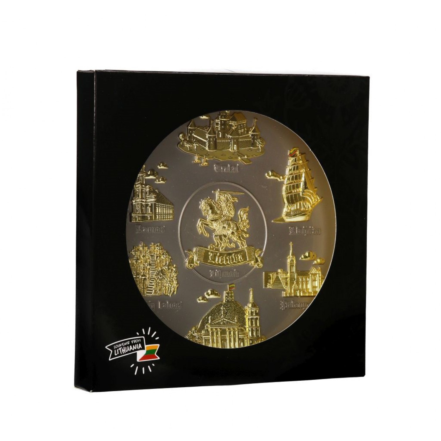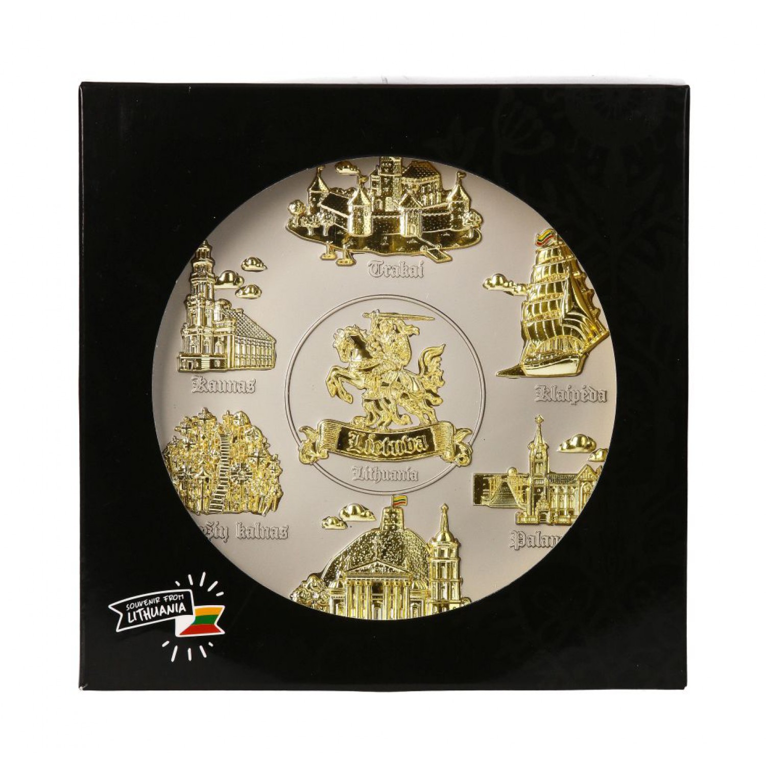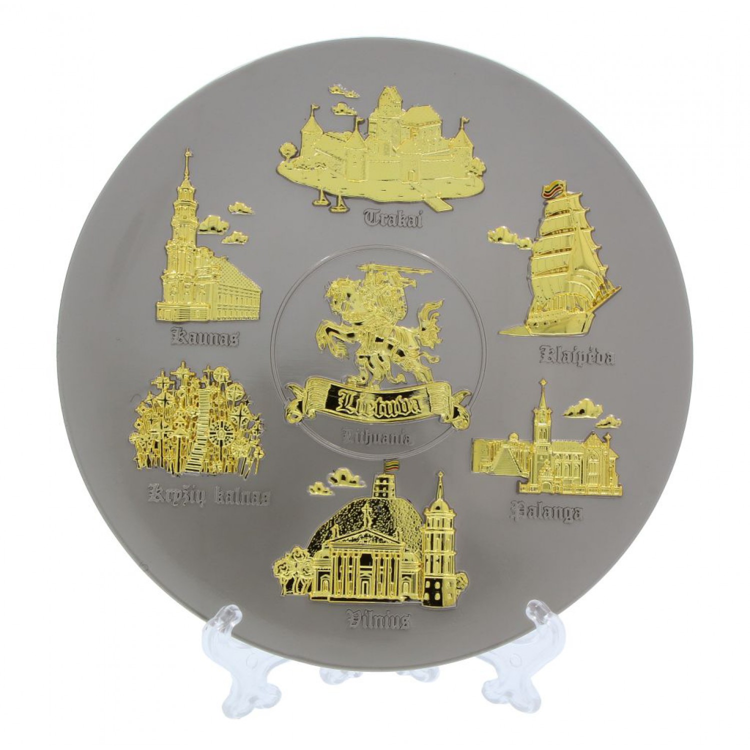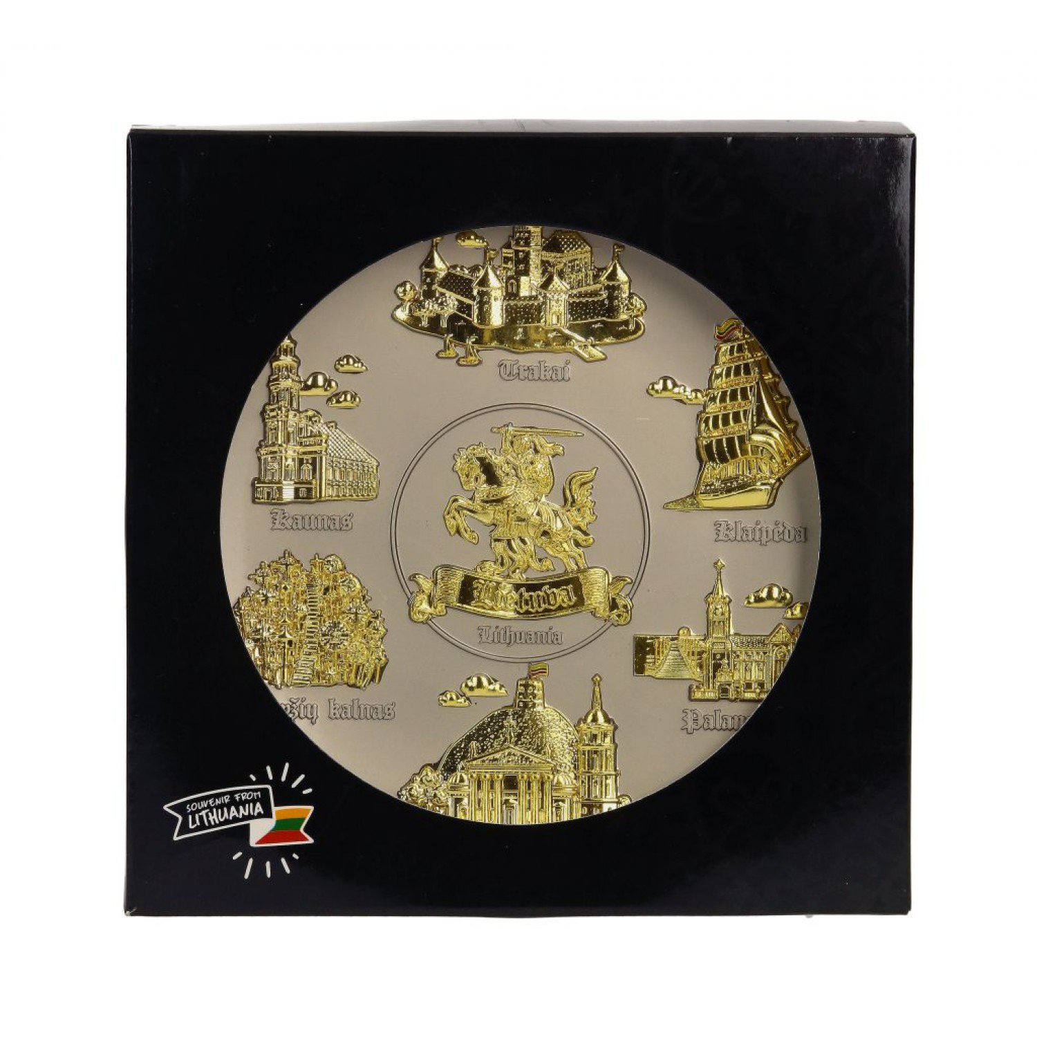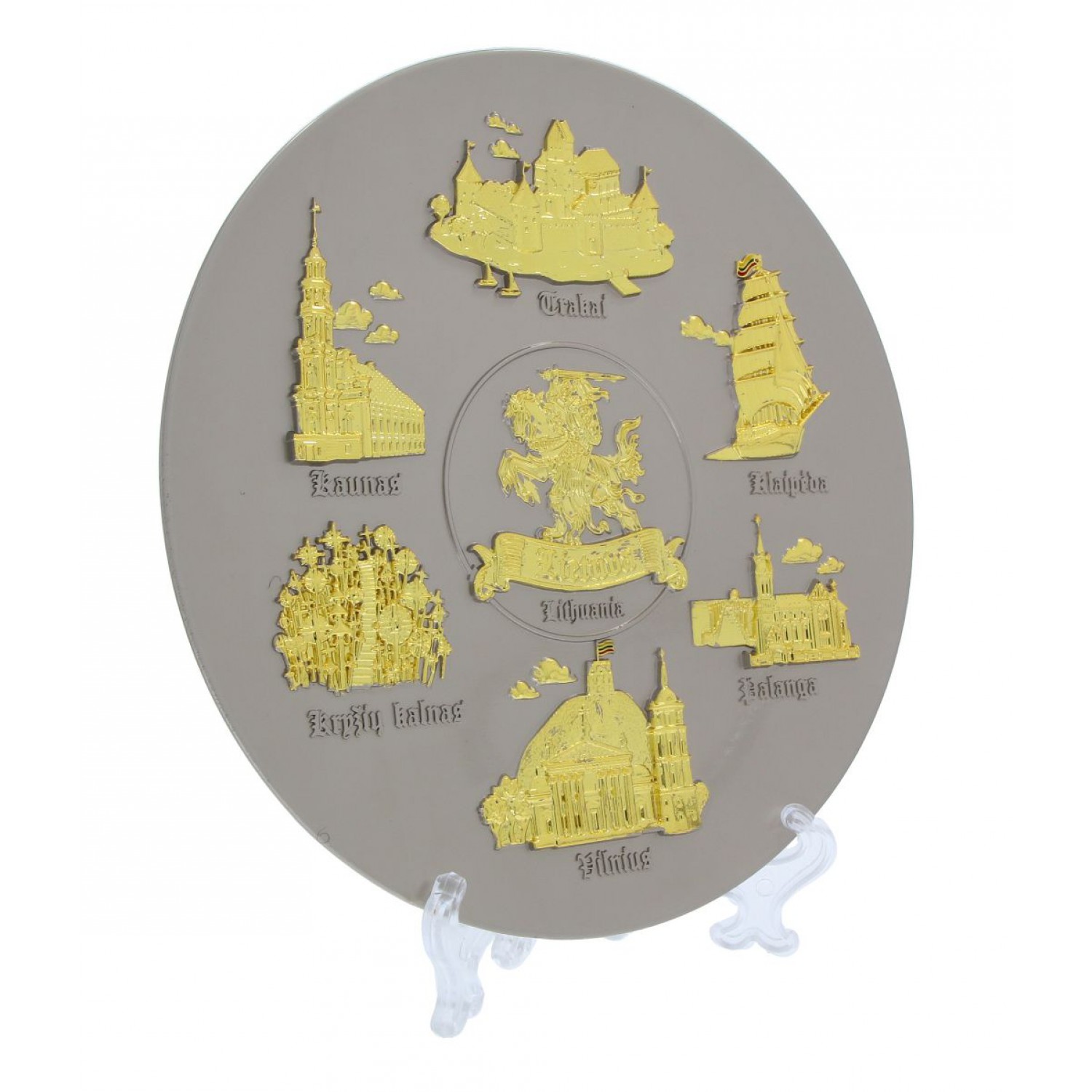 Suvenyrinė kabinama lėkštė Lietuva – sidabrinės spalvos lėkštė su auksinės spalvos Lietuvos miestų objektais. Tautinis suvenyras, kabinamas ant sienos.