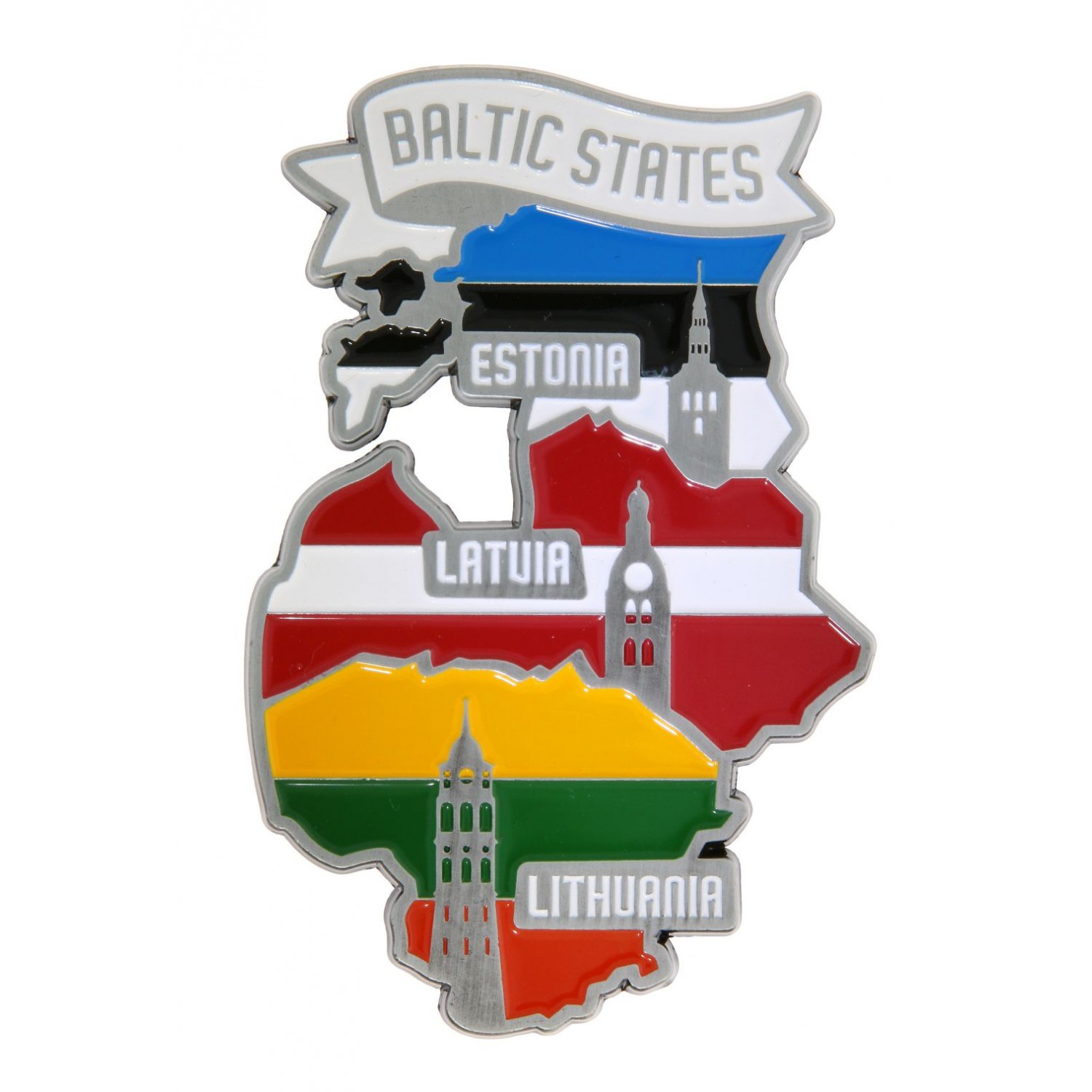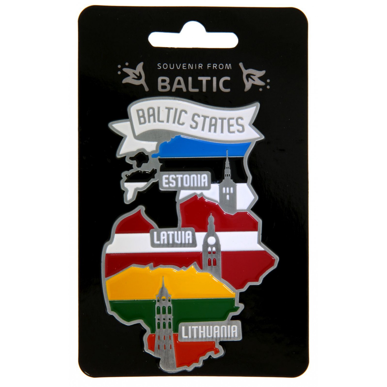 Metalinis suvenyrinis šaldytuvo magnetas su Baltijos valstybių – Lietuvos, Latvijos ir Estijos – kontūrais. Dekoruotas šalių vėliavomis, pavadinimais ir simboliniais architektūros motyvais. Puikus pasirinkimas suvenyrų parduotuvėms.