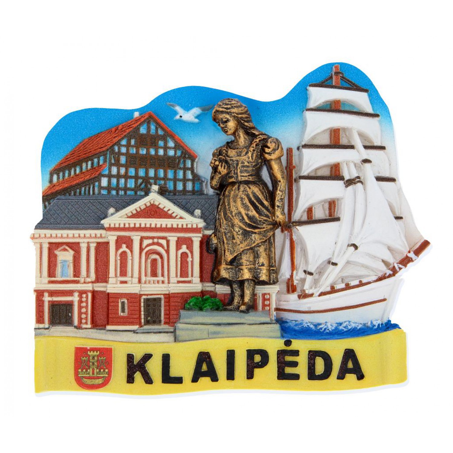 Polirezino magnetas su ryškiais Klaipėdos simboliais – Teatro aikšte, burlaiviu Meridianas ir skulptūra Taravos Anikė. Tvirtas ir dekoratyvus šaldytuvo magnetas, skirtas prekybai suvenyrų parduotuvėse.