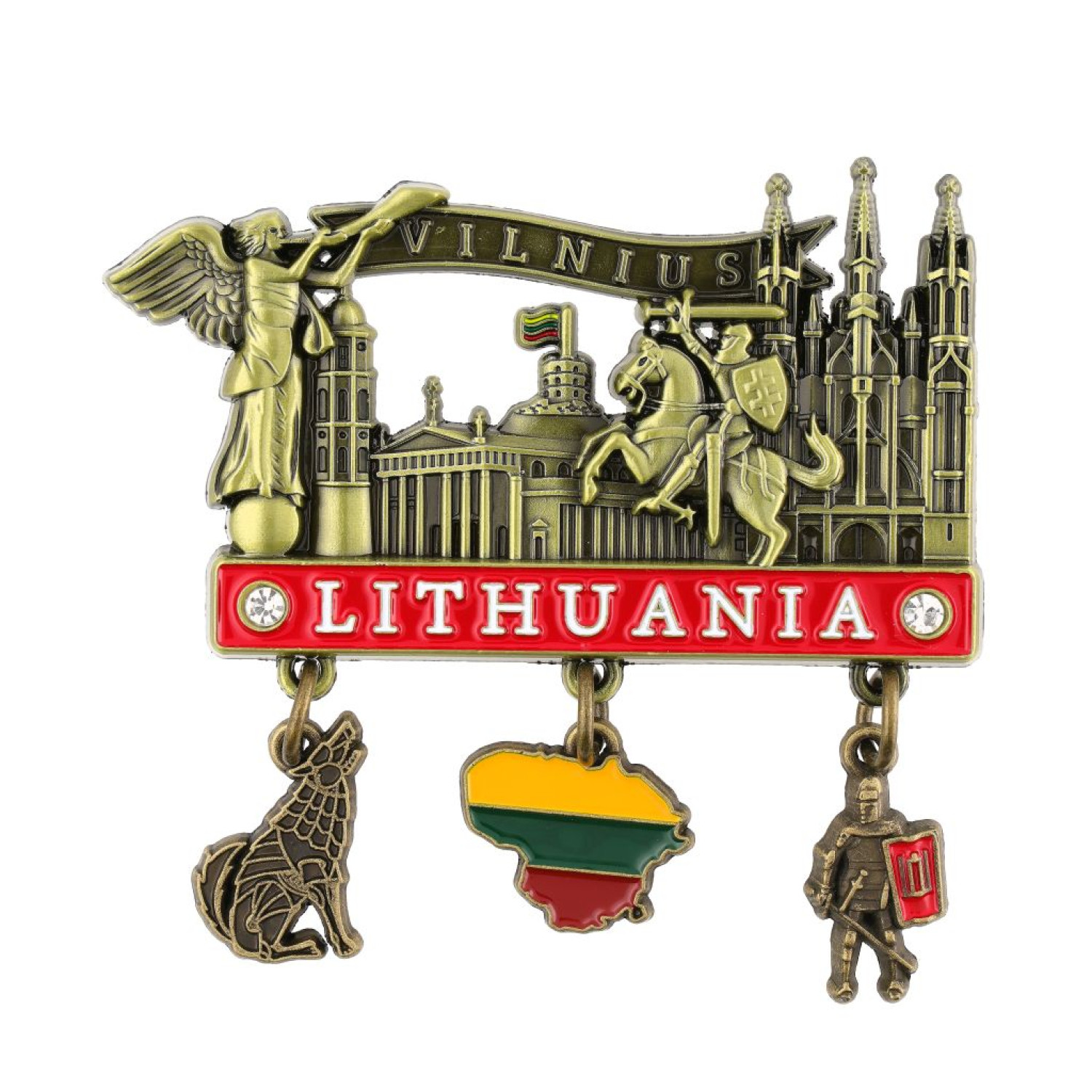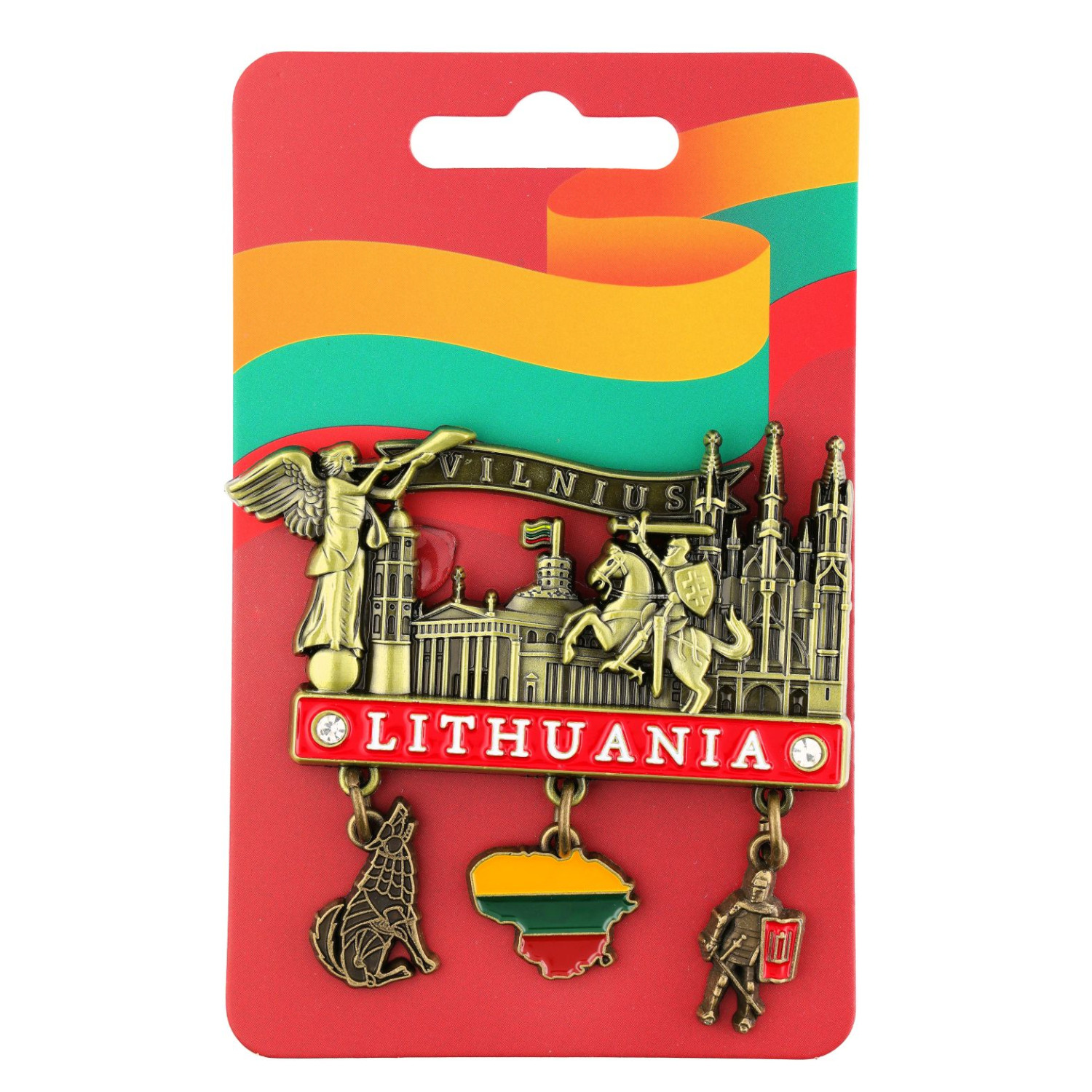 Išskirtinis suvenyrinis šaldytuvo magnetas su Vyčiu bei Vilniaus miesto simboliais ir užrašais Lithuania ir Vilnius. Dizainą puošia trys kabančios detalės: Geležinis Vilkas, Lietuvos žemėlapis su trispalve ir riteris. Magnetas pagamintas iš kokybiškų medžiagų, užtikrinančių patvarumą ir ilgaamžiškumą.