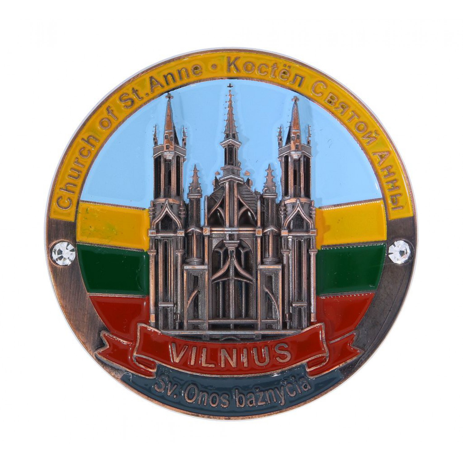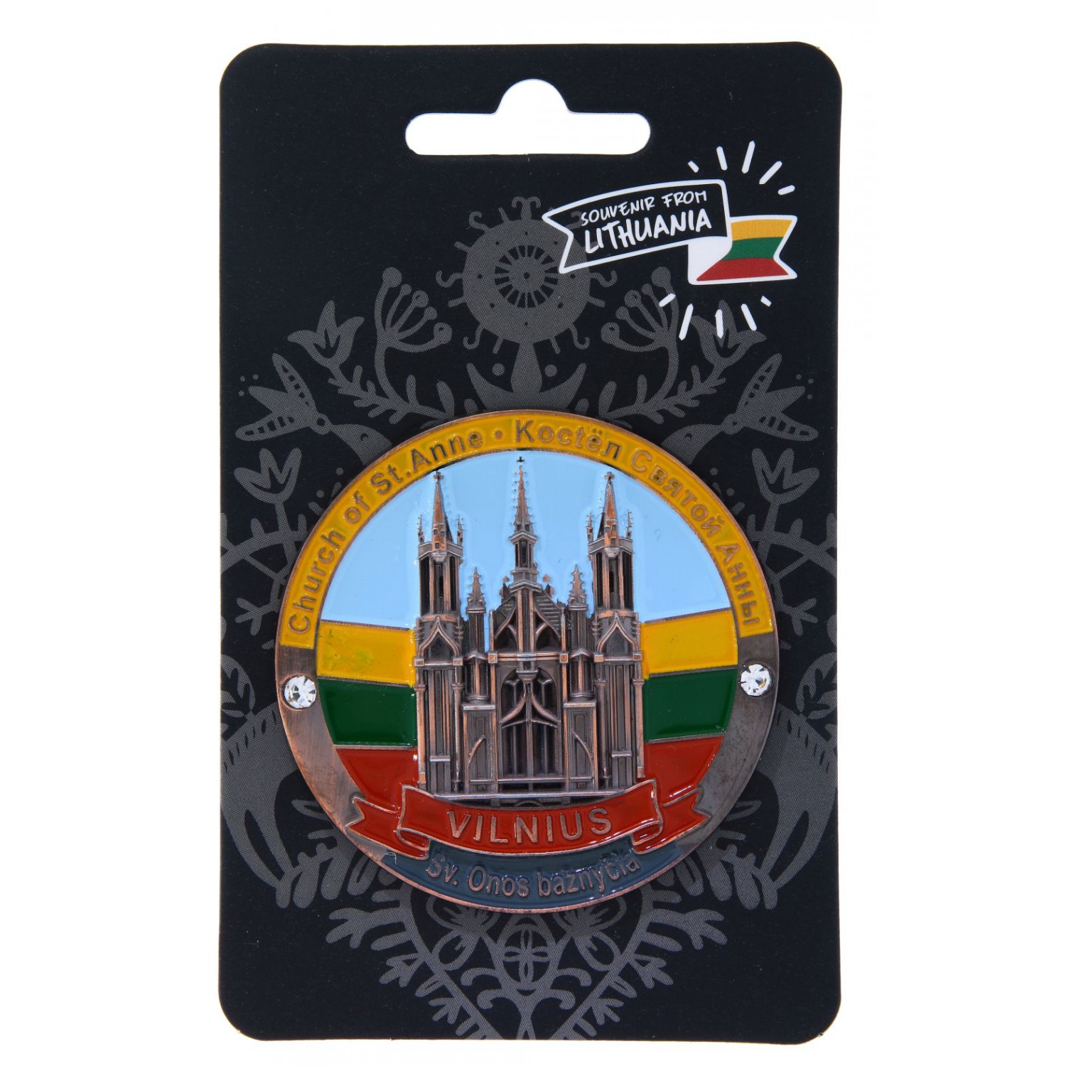 Apvalus suvenyrinis magnetas su viena garsiausių Vilniaus gotikinių architektūros vertybių – Šv. Onos bažnyčia. Fone – Lietuvos trispalvė.