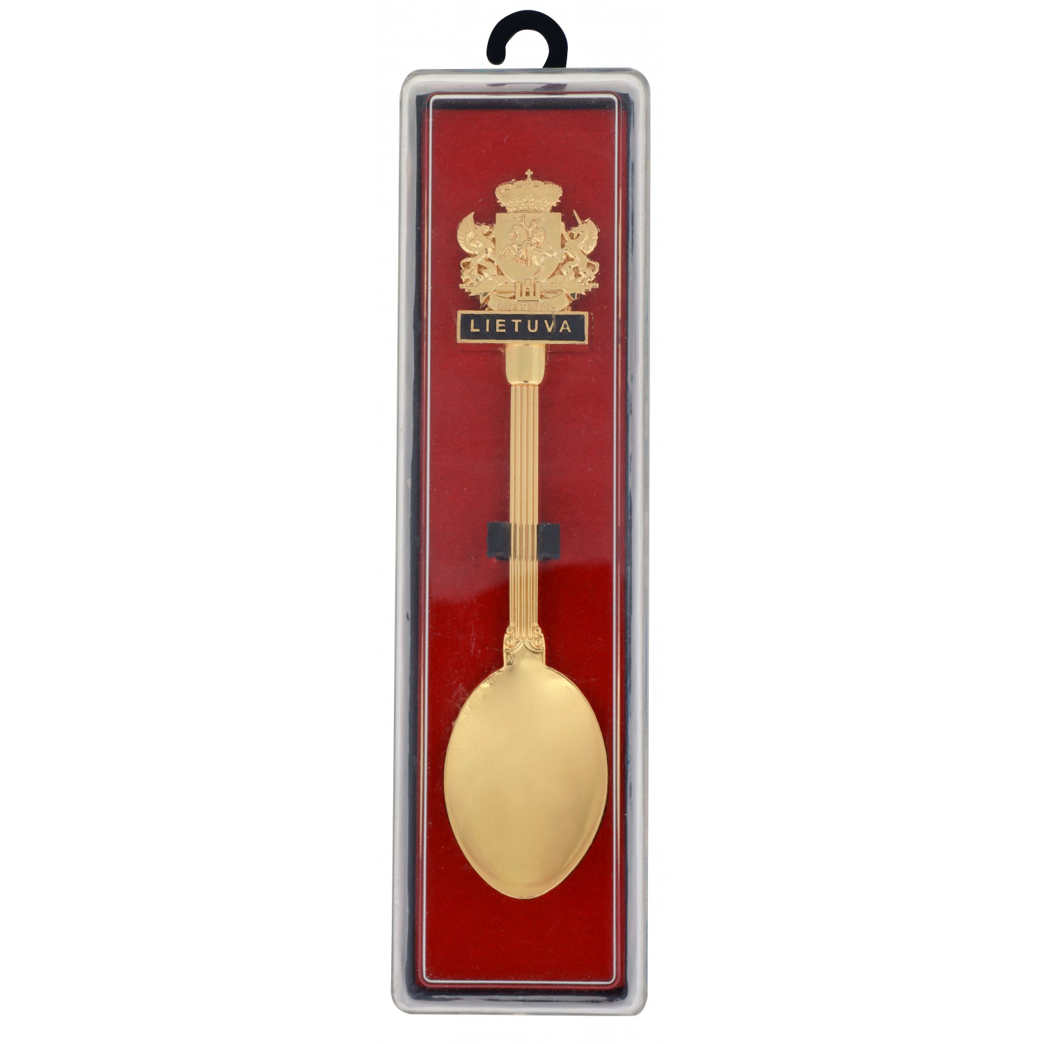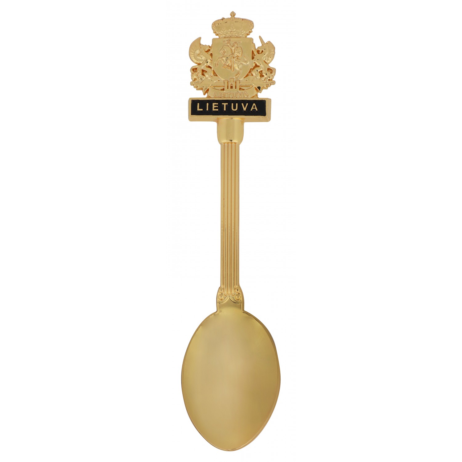 Aukso spalvos suvenyrinis šaukštelis su užrašu Lietuva ir herbo simbolika. Pagamintas iš metalo, dekoratyvus, netinka sąlyčiui su maistu. Skirtas suvenyrų didmeninei prekybai.