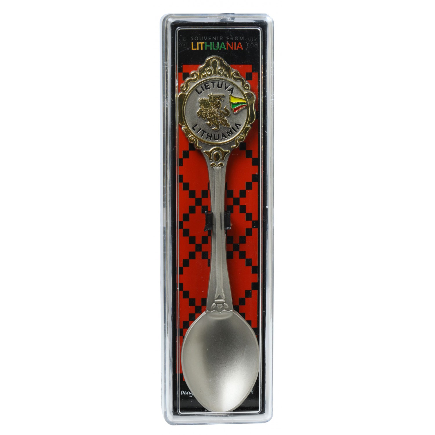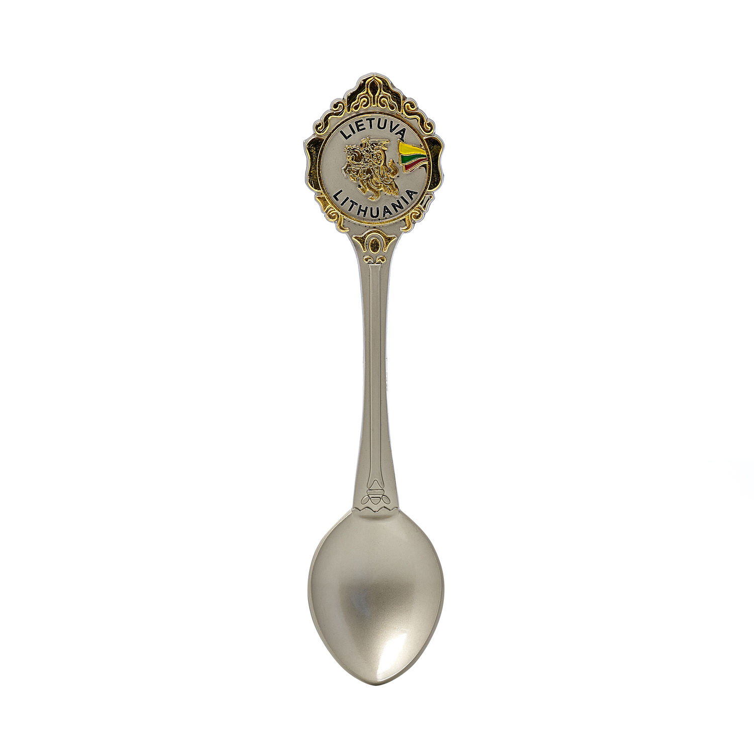 Suvenyrinis šaukštelis su Lietuvos simbolika – Lietuvos vėliava ir Vytis. Elegantiško dizaino, metalinis, su dekoratyviniu elementu. Netinka sąlyčiui su maistu.