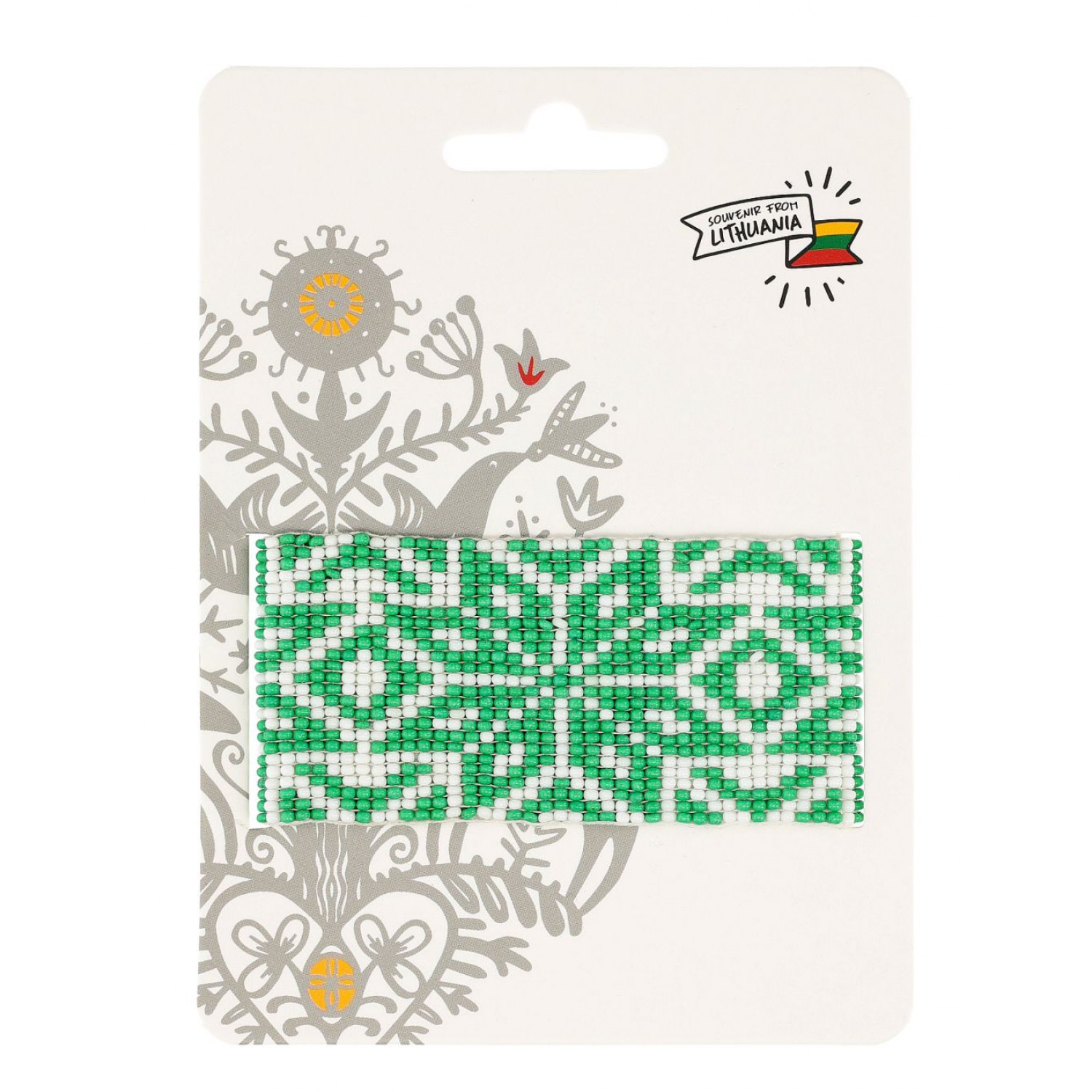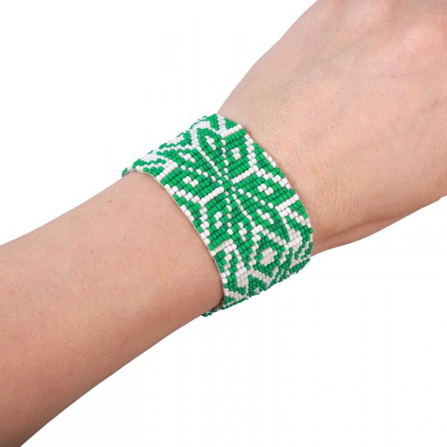 Rankų darbo apyrankė, suverta iš smulkių karoliukų, derinant baltą ir žalią spalvas. Raštas atkartoja tradicinius lietuvių tautinius motyvus. Apyrankės plotis – 3,5 cm. Tai ne tik estetiškas aksesuaras, bet ir subtili nuoroda į tautinę tapatybę. Tinka kasdienai ar ypatingoms progoms.