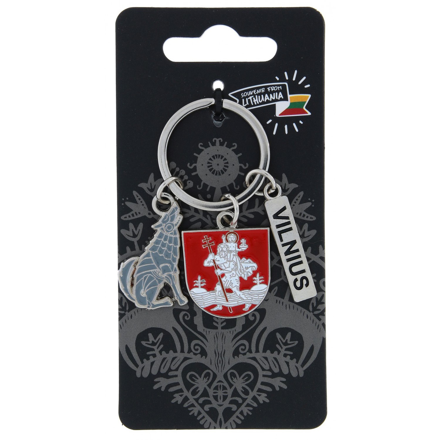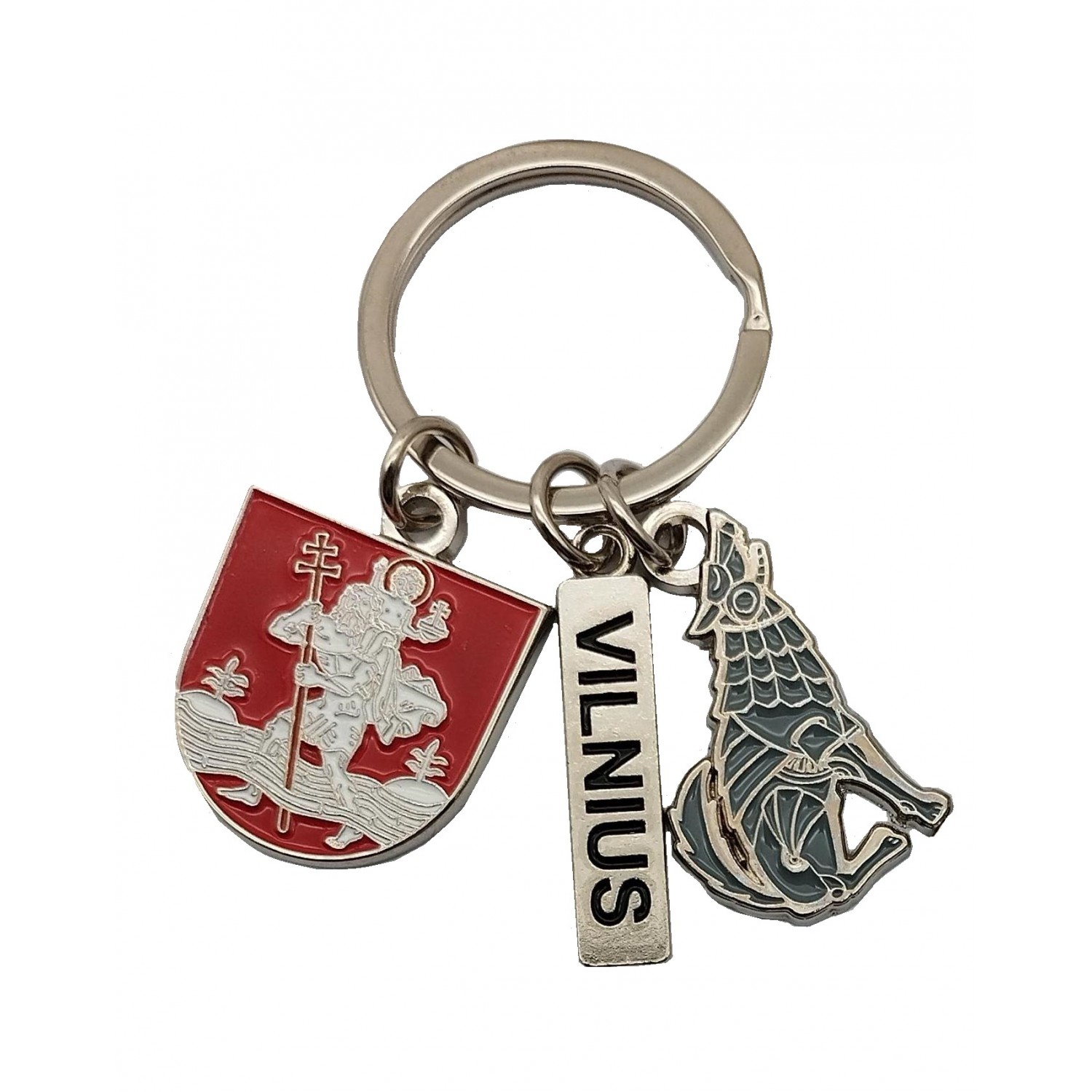 Metalinis raktų pakabukas iš trijų dalių: su užrašu Vilnius, Vilniaus herbu (Šv. Kristoforu) ir Geležinio Vilko simboliu. Kiekviena detalė atspindi sostinės tapatybę ir kultūrinį paveldą.