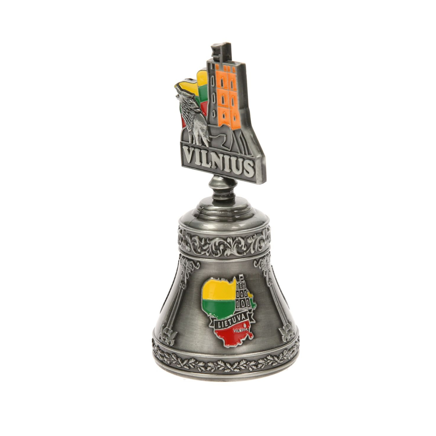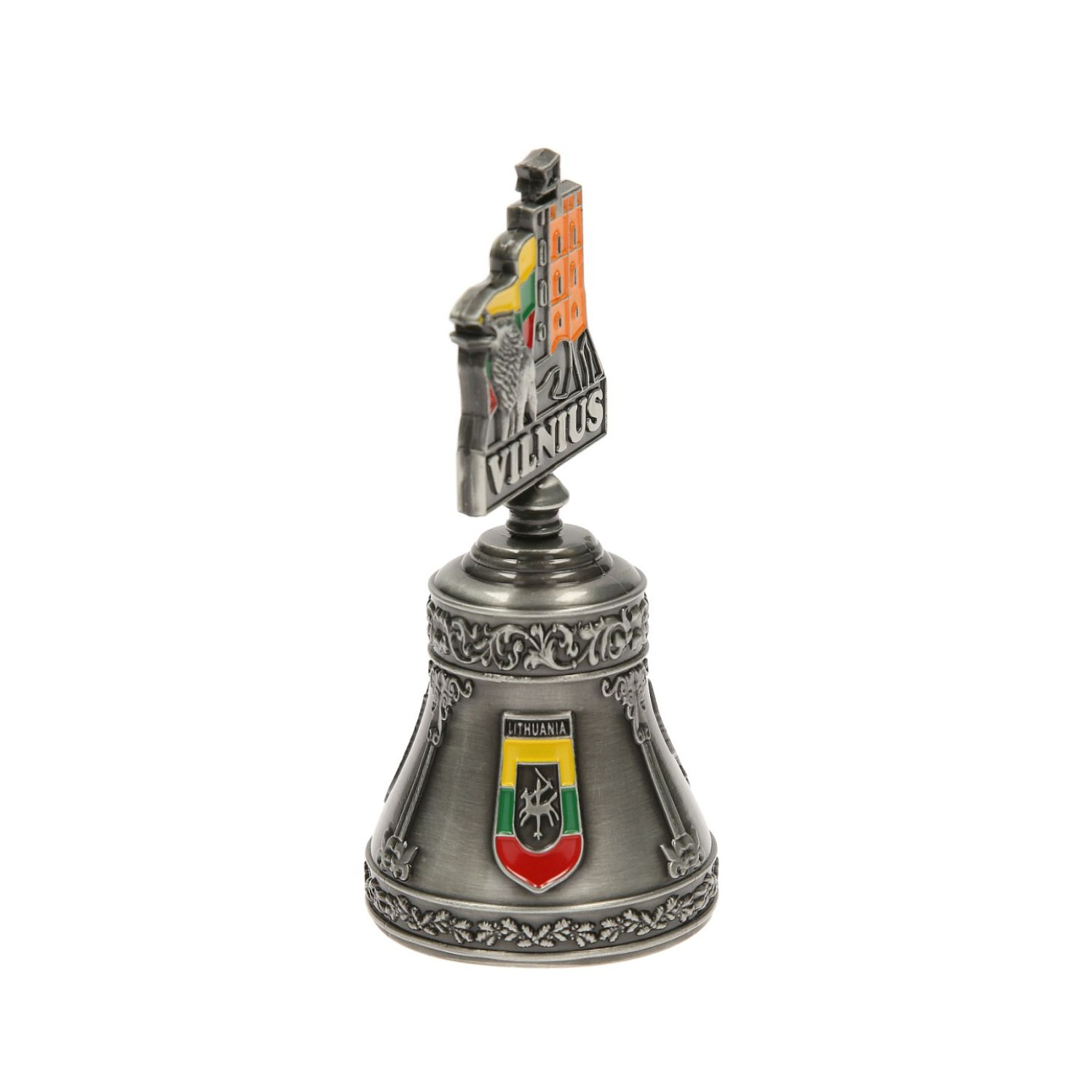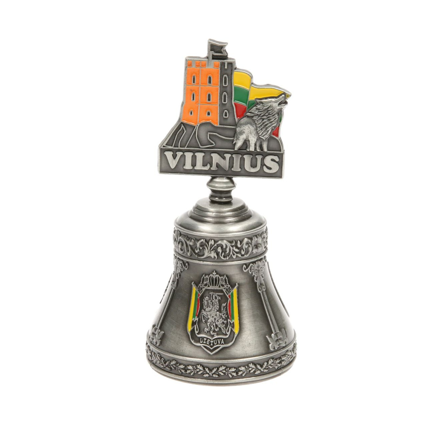 Metalinis suvenyrinis varpelis, dekoruotas Vilniaus simboliais – Gedimino bokštu ir geležiniu vilku. Išraiškingas detalumas ir kokybiškas apdaila. Puikus pasirinkimas suvenyrų prekybai.