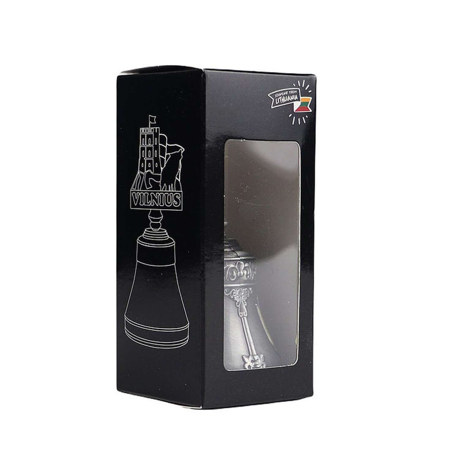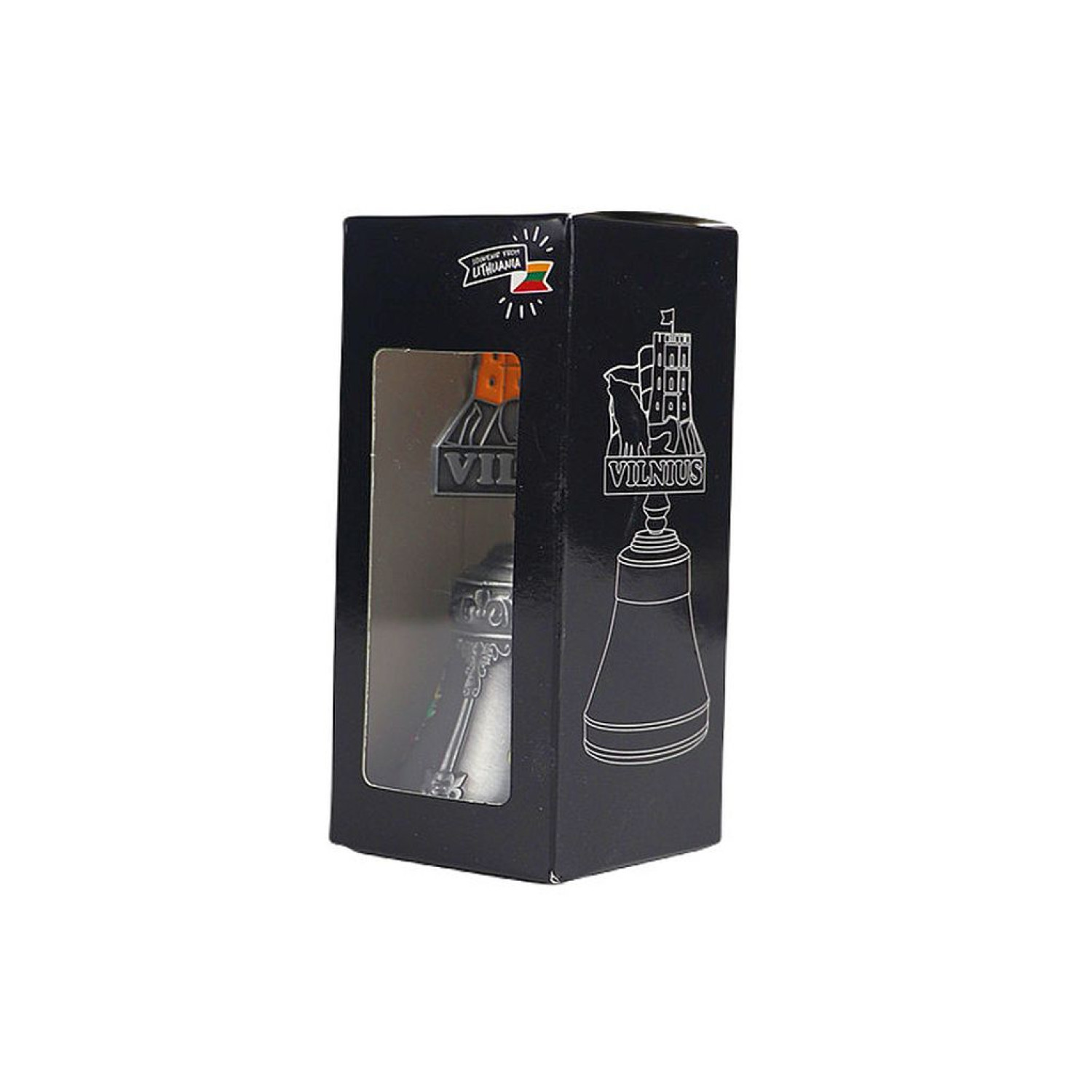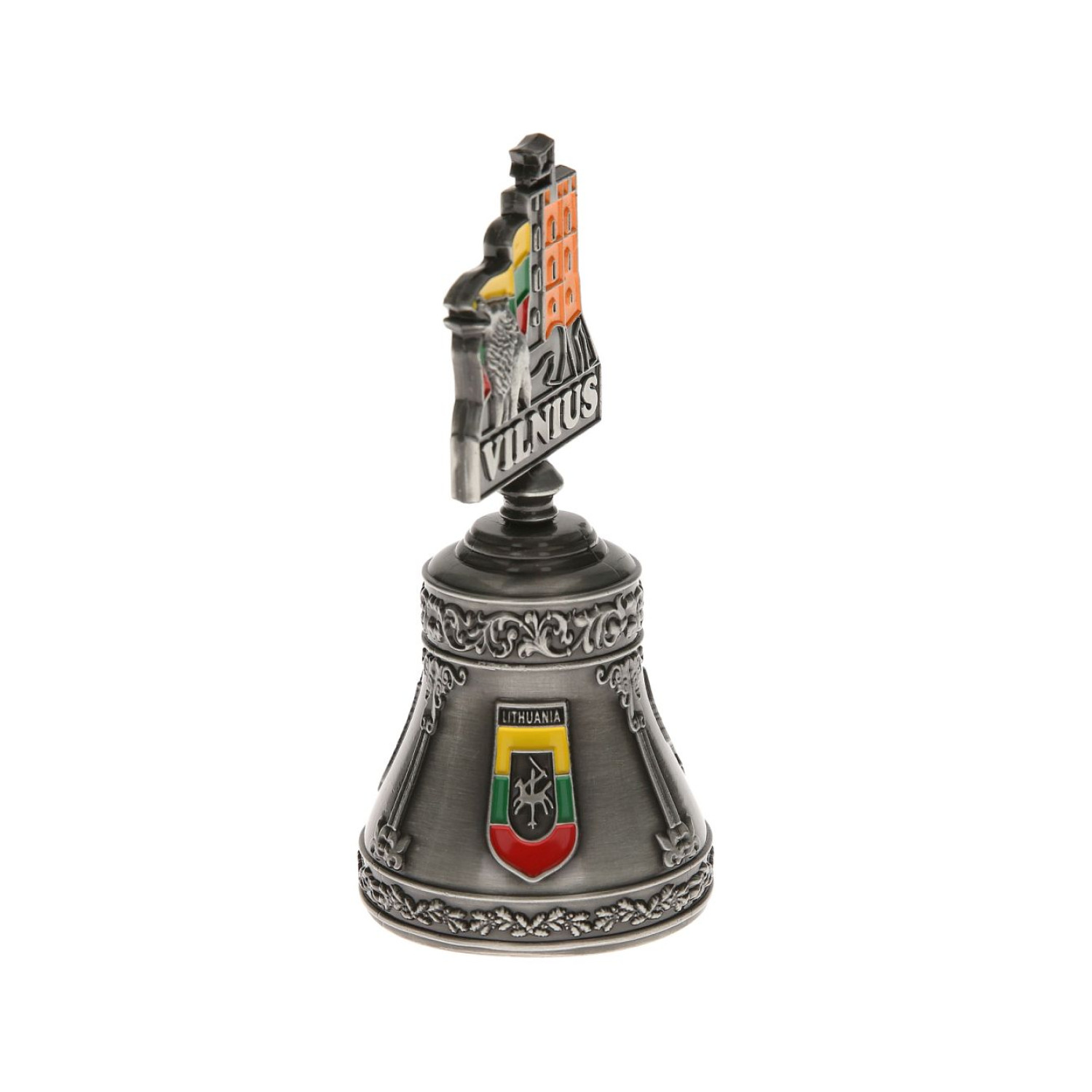 Metalinis suvenyrinis varpelis, dekoruotas Vilniaus simboliais – Gedimino bokštu ir geležiniu vilku. Išraiškingas detalumas ir kokybiškas apdaila. Puikus pasirinkimas suvenyrų prekybai.