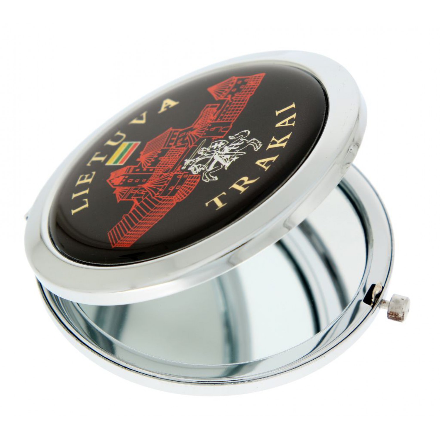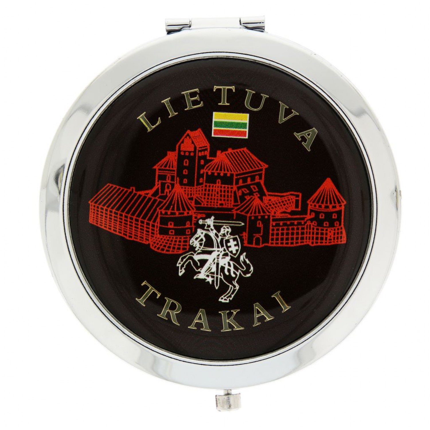 Veidrodėlis su Trakų pilies piešiniu – kompaktiškas ir praktiškas aksesuaras, puikiai tinkantis kasdieniam naudojimui ar kaip autentiškas lietuviškas suvenyras. Idealiai tinka prekybai suvenyrais.
