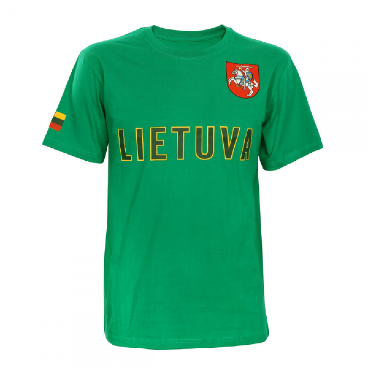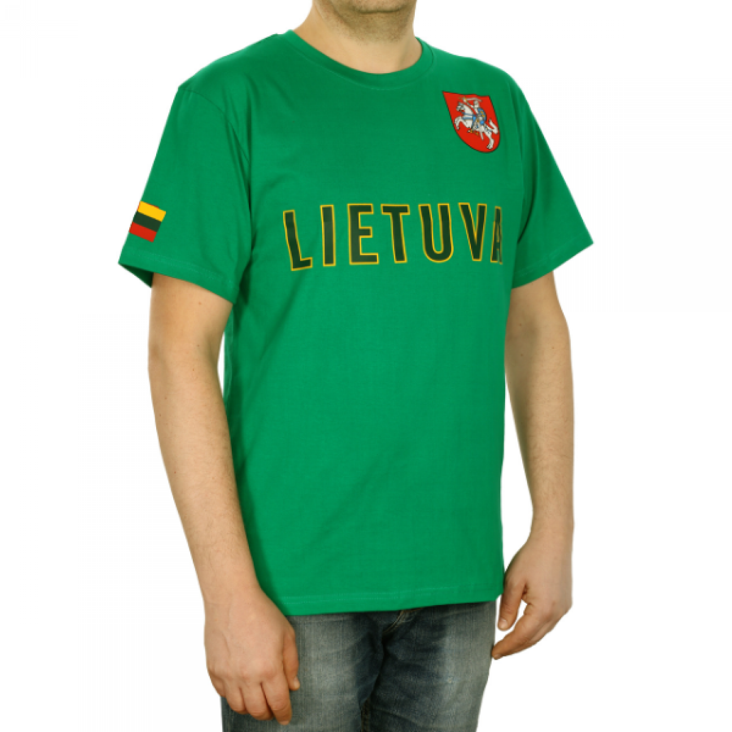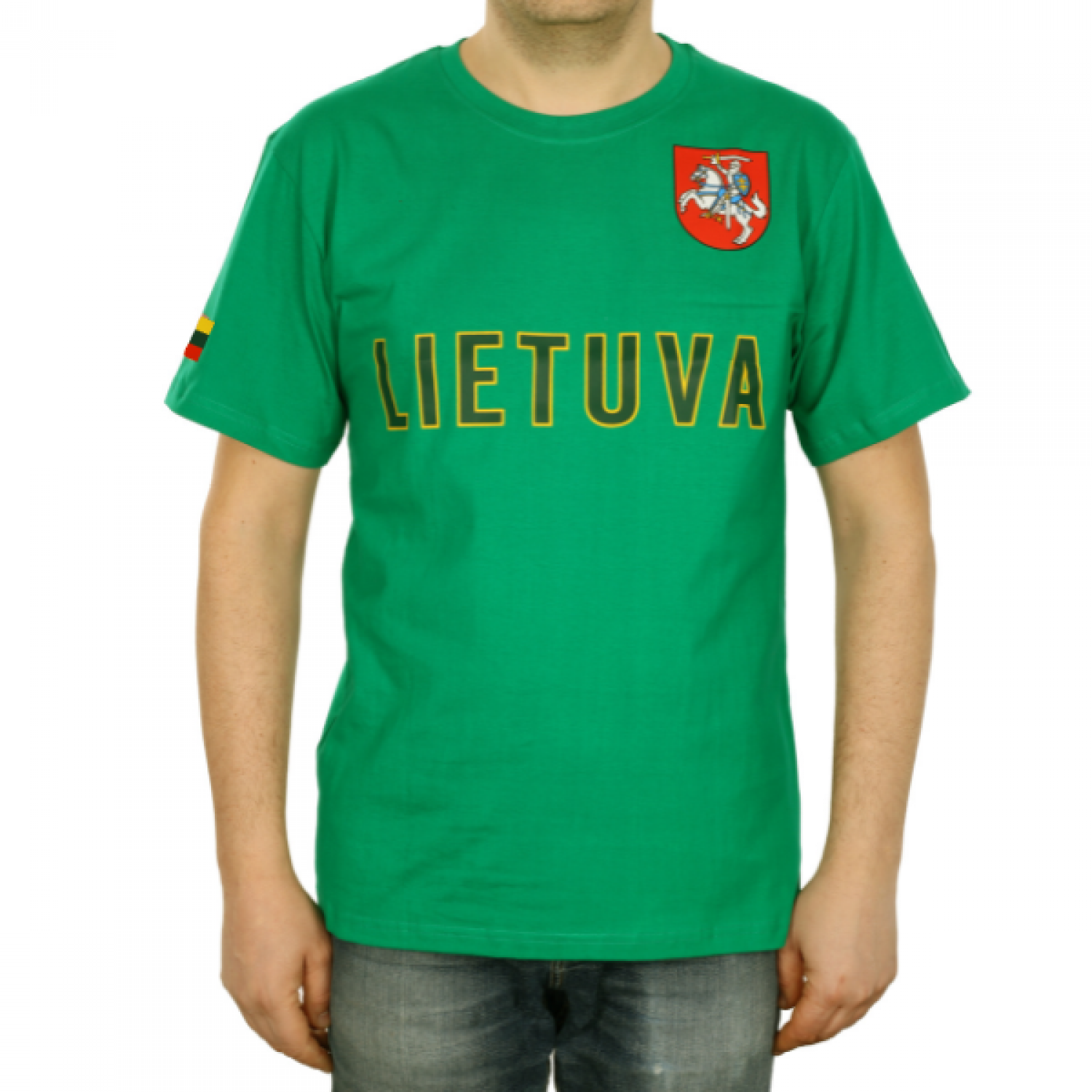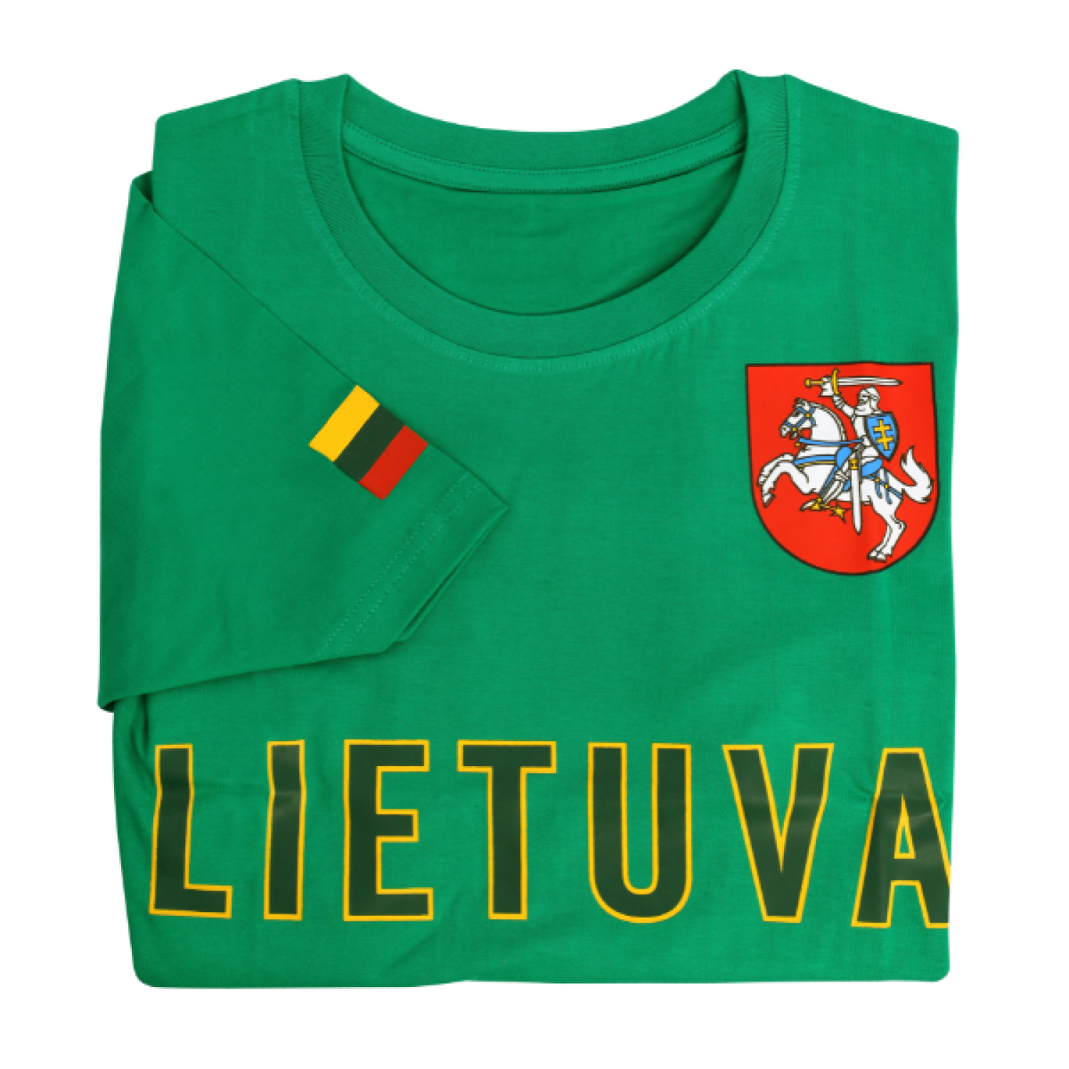 Žalios spalvos Lietuvos sirgalio marškinėliai trumpomis rankovėmis, su ryškiu geltonu užrašu Lietuva priekyje. Ant krūtinės – stilizuotas Lietuvos herbas (Vytis). Ant rankovės – Lietuvos trispalvė vėliava. Komfortiški, unisex modelis, tinkantis tiek kasdieniam nešiojimui, tiek sporto renginiams.