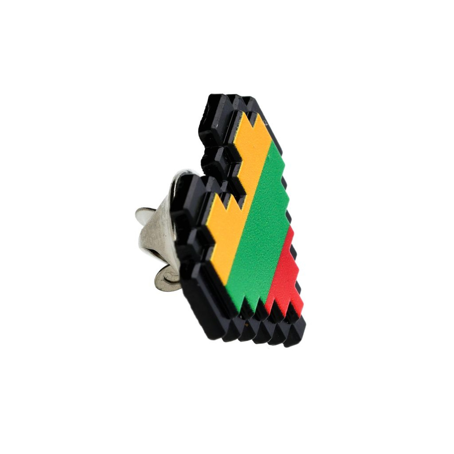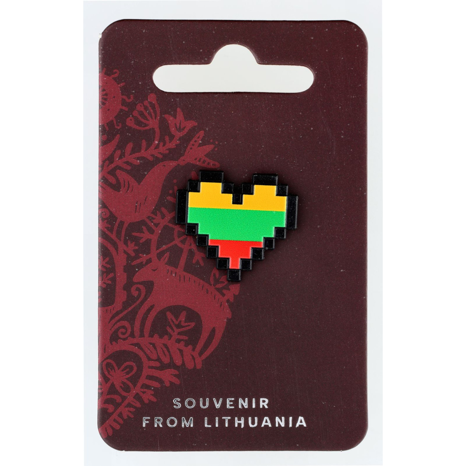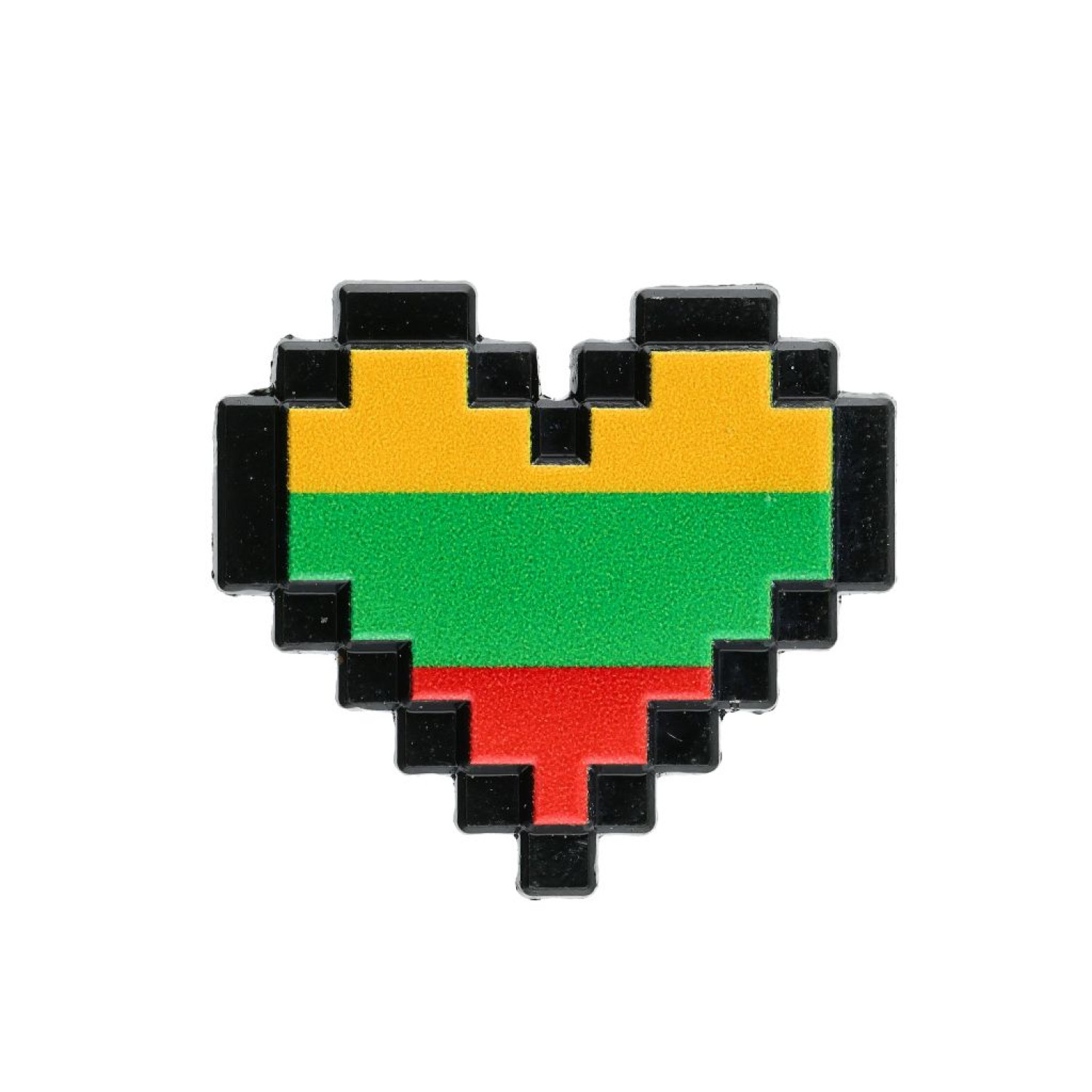 Stilingas ženkliukas pikselių (pixel) širdelė Lietuvos vėliavos spalvų – modernus patriotiškas akcentas. Labai tinkantis kompiuterinių žaidimų mėgėjams. Puikiai tinka prie drabužių, kuprinės ar kepurės, taip pat kaip mažas suvenyras ar dovana.