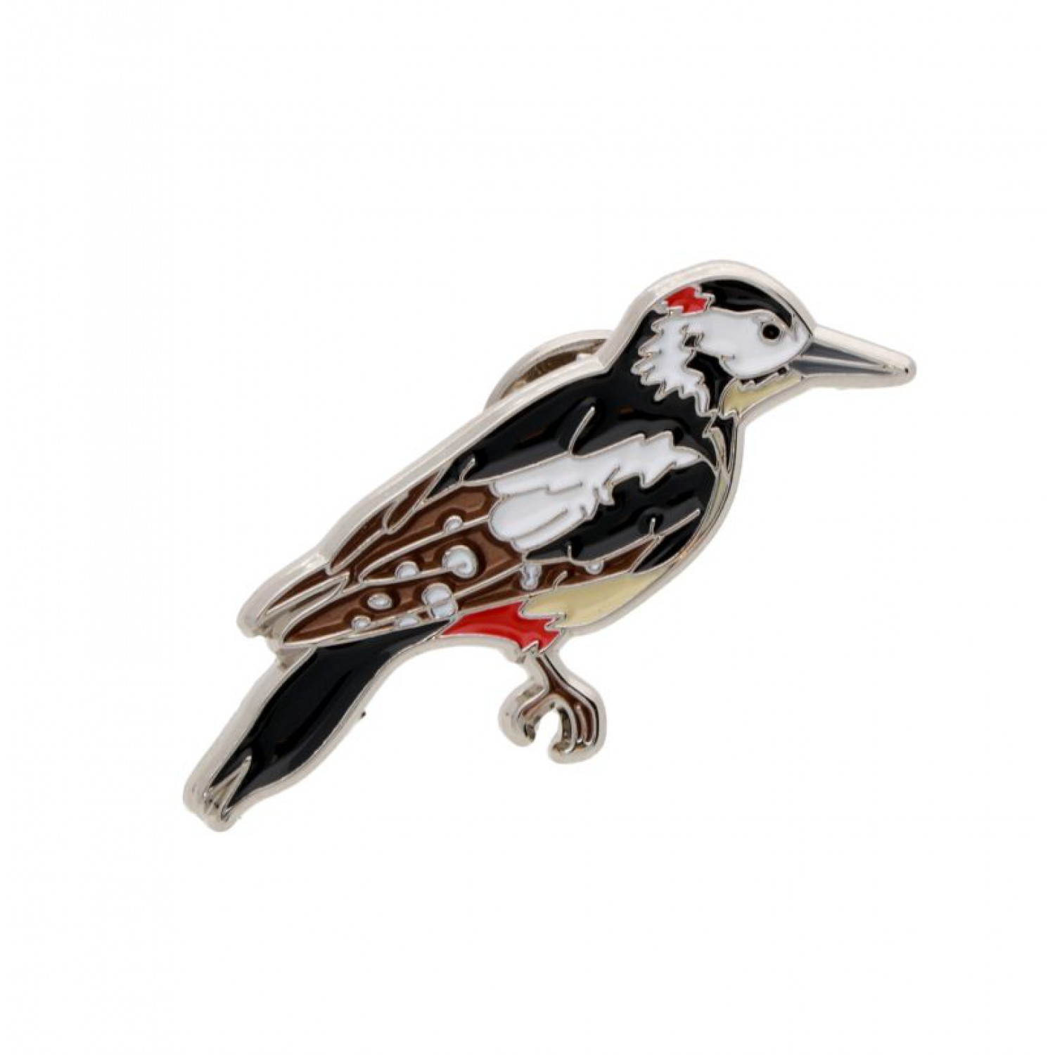 Įsegamas ženkliukas didysis margasis genys (lot. Dendrocopos major).